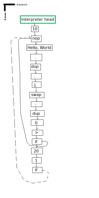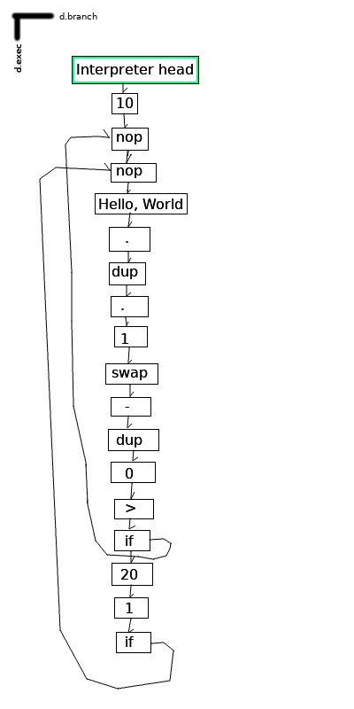 In the current implementation, because we jump to the linked cell instead of the clonehead[5] of the linked cell, each cell can be the entrance point for at most one direct branch — however, I see no reason this couldn’t be an implementation-dependent or dialect-dependent decision. Limiting jump points in this way makes analyzing certain structures easier since they collapse into well-defined loops, but circumventing this in order to jump to a particular point from many places involves injecting a bunch of no-op instructions, which should be avoided.[6]