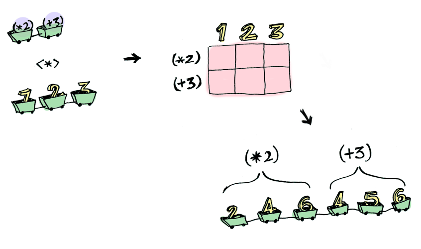 First of all, if you didn't read the previous post, go do so, otherwise you might be missing some essential concepts! _Simple enough. Lets extend this by saying that any value can be in a context. For now you can think of a context as a…_medium.com Kotlin Functors, Applicatives, And Monads in Pictures. Part 1/3 (draft) Applicatives Applicatives take it to the next level. With an applicative, our values are wrapped in a context, just like : Functors But our functions are wrapped in a context too! Yeah. Let that sink in. Applicatives don’t kid around. Unlike Haskell, doesn’t have a built-in way to deal with Applicatives. But it is very easy to add one! We can define an function for every type supporting Applicative, which knows how to apply a function wrapped in the context of the type to a value wrapped in the same context: Kotlin yet apply infix fun <A, B> Option<(A) -> B>.apply(f: Option<A>): Option<B> =when (this) {is Option.None -> Option.Noneis Option.Some -> f.map(this.value)} infix inline fun <A, reified B> Array<(A) -> B>.apply(a: Array<A>) =Array(this.size * a.size) {this[it / a.size](a[it % a.size])} If both and the function are , then the function is applied to the unwrapped option, otherwise is returned. this Some None For the I'm using its constructor parameters to generate the array, although note that this wouldn't be the most performant choice for bigger arrays. Array this would be the in Haskell, so again we could use a operator if needed. Note: <*> * i.e: Some({ a: Int -> a + 3 }) apply Some(2) // => Some(5) If you look carefully you will see that our operator only works in this specific order: why? Because our extension function is defined in that order. Then, couldn’t I just make another extension function to work the other way around, like: Option(function) apply Option(value) fun <A, B> Option<A>. (o: Option<(A) -> B>) = {...}fun <A, B> Option<(A) -> B>. (o: Option<A>) = {...} apply apply Technically not. Since Kotlin produces same code as Java would, it has to deal with our friend the . So basically those 2 functions would loose the generic types at compile time (and become just ), making them equal and therefore invalid. But here’s a trick, we could use a so called (and you can read why ) so it would look like: type erasure Option dummyImplicit here fun <A, B> Option<A>.apply(f: Option<(A) -> B>,dummyImplicit: Any? = null): Option<B> =when (this) {is Option.None -> Option.Noneis Option.Some -> f.map { it(value) }} This allows us to do: Some(2). (Some( a: Int a + 3 )) apply { -> } // => Some(5) But unfortunately it makes the infix impossible since infix functions only have one parameter :( So, following our previous explanation, using can lead to some interesting situations. For example: apply arrayOf<(Int) -> Int>({ it + 3 }, { it * 2 }) arrayOf(1, 2, 3) apply // => [ 4, 5, 6, 2, 4, 6 ] Note: the original article now shows how Applicatives are more powerful than Functors in that they allow function application with multiple parameters. Again this is not feasible in vanilla Kotlin, but we can work around it by defining the function we want to handle in a curried way . Here’s something you can do with Applicatives that you can’t do with Functors. How do you apply a function that takes two arguments to two wrapped values? fun curriedAddition(a: Int) = { b: Int ->a + b} Some(3) map ::curriedAddition map Some(2) // => COMPILER ERROR Applicatives: Some(3) map ::curriedAddition apply Some(2)// => Some(5) Wait, what?? Let me break it down step by step: Some(3) map ::curriedAddition// => Some({ 3 + b }) Some({ 3 + b }) apply Some(2)// => Some(5) pushes aside. “Big boys can use functions with any number of arguments,” it says. “Armed with map and apply, I can take any function that expects any number of unwrapped values. Then I pass it all wrapped values, and I get a wrapped value out! AHAHAHAHAH!” Applicative Functor fun curriedTimes(a: Int) = b: Int a * b { -> } Some(3) map ::curriedTimes apply Some(5)// => Some(15) But wait, what if we want to go deeper? Suppose we have a triple product function: fun tripleProduct(a: Int, b: Int, c: Int) = a * b * c We want to do the same as before but we don't want to manually curry it, so we have a curry function, in this case for 3 params: fun <A, B, C, D> curry(f: (A, B, C) -> D): (A) -> (B) -> (C) -> D = a b c f(a, b, c) { -> { -> { -> } } } Thanks for the suggestion! Ľuboš Mudrák Well, that's easy: Some(3) map (::tripleProduct) apply Some(5) apply Some(4)// => Some(60) curry That’s it! Hope you enjoyed this second part as much as I did while writting it, remember that you can find all the code in the and hope to see you in the next and final series! playground repo I created The third and final part is already available" _This is a translation of Functors, Applicatives, And Monads In Pictures from Haskell into Kotlin._medium.com Kotlin Functors, Applicatives, And Monads in Pictures. Part 3/3