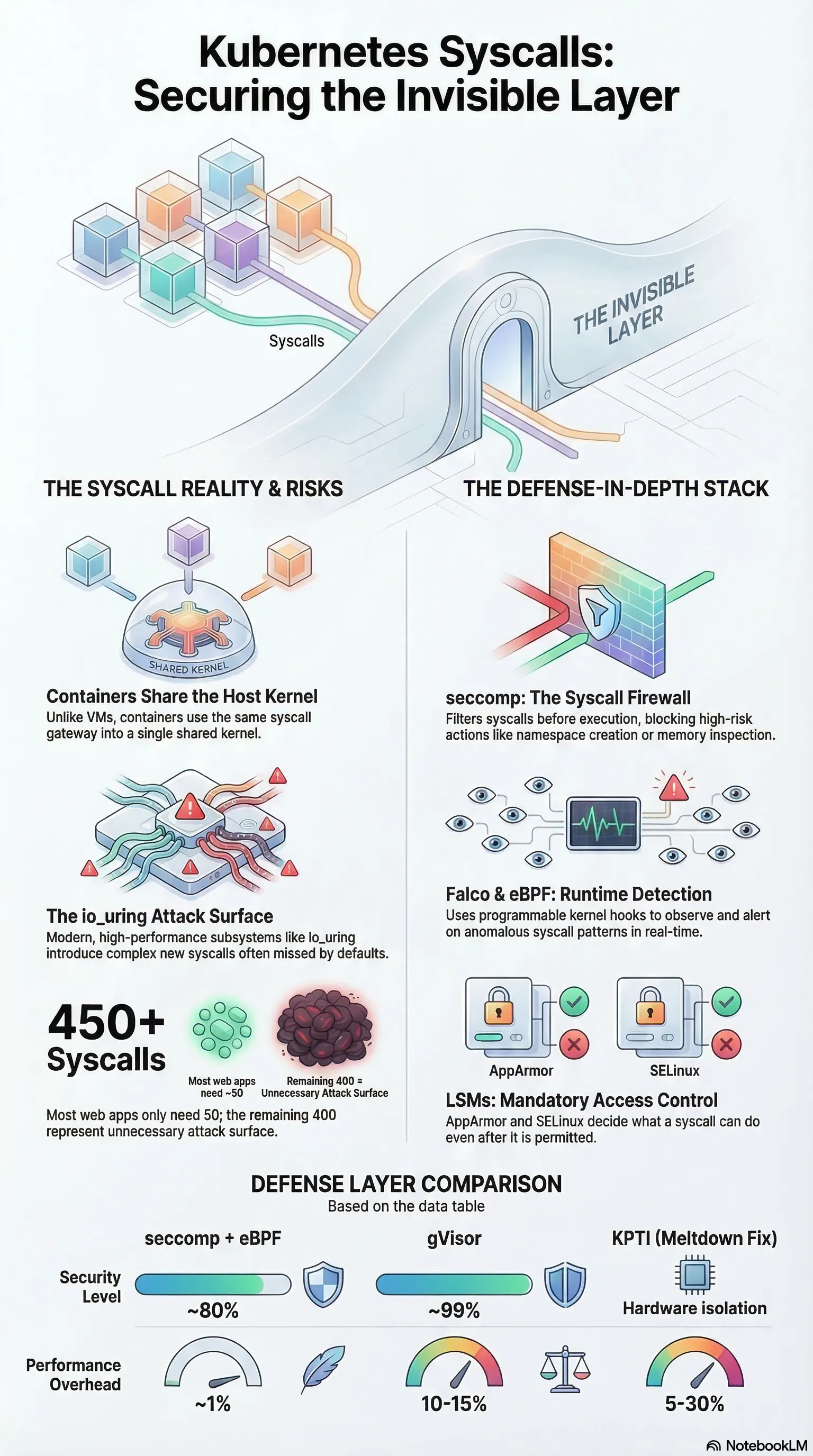 Every abstraction in Kubernetes — containers, namespaces, cgroups, networking — eventually collapses into a syscall. If you want to reason seriously about security, observability, and performance at the platform level, you need to understand what’s happening at this layer. Every abstraction in Kubernetes — containers, namespaces, cgroups, networking — eventually collapses into a syscall. If you want to reason seriously about security, observability, and performance at the platform level, you need to understand what’s happening at this layer. Table of Contents The Problem With “Containers Are Isolated” What Is a Syscall, Really? The io_uring Problem The CPU Privilege Model Anatomy of a Syscall How Containers Change the Equation The Kubernetes Security Stack — Layer by Layer seccomp: Your Syscall Firewall Falco: Syscall-Level Runtime Detection eBPF: Programmable Kernel Hooks gVisor: The User-Space Kernel LSMs: Mandatory Access Controls Real-World Scenarios Performance Implications What a Staff Engineer Should Own Further Reading The Problem With “Containers Are Isolated” What Is a Syscall, Really? The io_uring Problem io_uring The CPU Privilege Model Anatomy of a Syscall How Containers Change the Equation The Kubernetes Security Stack — Layer by Layer seccomp: Your Syscall Firewall Falco: Syscall-Level Runtime Detection eBPF: Programmable Kernel Hooks gVisor: The User-Space Kernel LSMs: Mandatory Access Controls seccomp: Your Syscall Firewall Falco: Syscall-Level Runtime Detection eBPF: Programmable Kernel Hooks gVisor: The User-Space Kernel LSMs: Mandatory Access Controls seccomp: Your Syscall Firewall Falco: Syscall-Level Runtime Detection eBPF: Programmable Kernel Hooks gVisor: The User-Space Kernel LSMs: Mandatory Access Controls Real-World Scenarios Performance Implications What a Staff Engineer Should Own Further Reading The Problem With “Containers Are Isolated” When engineers first learn Kubernetes, they’re told: containers are namespaced processes. And that’s mostly true — namespaces isolate PIDs, mount points, and network interfaces; cgroups constrain CPU and memory. The abstraction holds well enough. containers are namespaced processes Until it doesn’t. In 2019, CVE-2019-5736 exploited a file-descriptor mishandling bug in runc: a container process running as root could open /proc/self/exe, which transparently resolves to the host’s runc binary via procfs semantics — bypassing normal symlink sandboxing. The container could overwrite the runc binary mid-execution and gain host root. In 2022, CVE-2022-0492 found a missing capability check in the kernel’s cgroup_release_agent_write function — a container without CAP_SYS_ADMIN in the host namespace could create a new user namespace via unshare, mount cgroupfs inside it, and write an arbitrary path to release_agent. When the cgroup emptied, the kernel executed that path as root on the host. In 2019, CVE-2019-5736 exploited a file-descriptor mishandling bug in runc: a container process running as root could open /proc/self/exe, which transparently resolves to the host’s runc binary via procfs semantics — bypassing normal symlink sandboxing. The container could overwrite the runc binary mid-execution and gain host root. In 2019, CVE-2019-5736 exploited a file-descriptor mishandling bug in runc: a container process running as root could open /proc/self/exe, which transparently resolves to the host’s runc binary via procfs semantics — bypassing normal symlink sandboxing. The container could overwrite the runc binary mid-execution and gain host root. CVE-2019-5736 runc /proc/self/exe runc procfs runc In 2022, CVE-2022-0492 found a missing capability check in the kernel’s cgroup_release_agent_write function — a container without CAP_SYS_ADMIN in the host namespace could create a new user namespace via unshare, mount cgroupfs inside it, and write an arbitrary path to release_agent. When the cgroup emptied, the kernel executed that path as root on the host. In 2022, CVE-2022-0492 found a missing capability check in the kernel’s cgroup_release_agent_write function — a container without CAP_SYS_ADMIN in the host namespace could create a new user namespace via unshare, mount cgroupfs inside it, and write an arbitrary path to release_agent. When the cgroup emptied, the kernel executed that path as root on the host. CVE-2022-0492 cgroup_release_agent_write CAP_SYS_ADMIN unshare release_agent Both exploits were entirely syscall-driven — no memory corruption required. Crucially, both were blocked by the Docker default seccomp profile and AppArmor — which is precisely why those defaults exist, and why disabling them on production workloads is so dangerous. blocked by the Docker default seccomp profile and AppArmor The root cause in every container escape: containers share the host kernel. And the kernel is reached exclusively through syscalls. containers share the host kernel If you’re a platform or infrastructure engineer running multi-tenant Kubernetes, this isn’t a security team problem. It’s your problem. And it starts with understanding syscalls. What Is a Syscall, Really? Your application — whether it’s written in Go, Python, Java, or Rust — runs in user space. It has no direct access to hardware, the filesystem, or the network. It cannot allocate physical memory. It cannot open a socket. user space To do any of these things, it must ask the kernel — and the only mechanism to do that is a system call (syscall). system call (syscall) Think of it like this: your application is a tenant in an apartment building. The kernel is the building manager who controls access to electricity, water, and the internet. The syscall is the intercom — the only way to request something from the manager. Linux exposes roughly 450 syscalls on x86-64 as of modern 6.x kernels (kernel 5.4 had ~435; kernel 6.1 reached ~450; 6.8+ ~460). The count grows with each release as new interfaces like