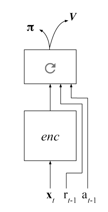 Reinforcement provides a framework for training agents to solve problems in the world. One of the limitations of these agents however is their inflexibility once trained. They are able to to solve a specific problem (formalized as an ), but that learned policy is often useless in new problems, even relatively similar ones. Learning learn a policy MDP Imagine the simplest possible agent: one trained to solve a two-armed bandit task in which one arm always provides a positive reward, and the other arm always provides no reward. Using any RL algorithm such as or , the agent can quickly learn to always choose the arm with the positive reward. At this point we might be tempted to say we’ve built an agent that can solve two-arm bandit problems. But have we really? What happens if we take our trained agent and give it a nearly identical bandit problem, except with the values of the arms switched? In this new setting, the agent will perform at worse than chance, since it will simply pick whatever it believed to be the correct arm before. In the traditional RL paradigm, our only recourse would be to train a new agent on this new bandit, and another new agent on another new task, etc, etc. Q-Learning Policy Gradient What if this retraining wasn’t necessary though? What if we could have the agent ? Such an agent could be trained to solve not just a single bandit problem, but all similar bandits it may encounter in the future as well. This approach to learning policies that learn policies is called Meta Reinforcement Learning (Meta-RL), and it is one of the more exciting and promising recent developments in the field. learn a policy for learning new policies In Meta-RL, an RNN-based agent is trained to learn to exploit the structure of the problem dynamically. In doing so, it can learn to solve new problems without the need for retraining, simply by adjusting its hidden state. The original work describing Meta-RL was published by and her colleagues at DeepMind last year in their paper: . I highly recommend checking out that original article for insight into the development of the algorithm. As it turns out this idea was also independently developed by the group at OpenAI and Berkeley and described in their recent paper Since I first became familiar with these concepts through the DeepMind paper, that is the one I followed in the design of my own implementation. Jane Wang Learning to Reinforcement Learn RL2: Fast Reinforcement Learning via Slow Reinforcement Learning . In this article I want to first describe how to augment the with the capacity to perform Meta-RL learning. Next I will show how it can be used to solve certain problems for which a meta-policy can be applied to solving families of MDPs without the need for retraining. The code for a implementation of the model as well as each of the experiments is available at this GitHub Repo: . A3C algorithm Tensorflow Meta-RL Making a Meta Agent The key ingredient in a Meta-RL system is a Recurrent Neural Network (RNN). This recurrent nature of this architecture is what allows the agent to learn the meta-policy, since it can adjust it’s output over time given new input. If that last bit sounds familiar, it is exactly what the traditional back-propagation training process of neural networks makes possible. Here instead, we will be training the RNN to learn to adjust itself by altering the hidden state, rather than needing backprop, or some other external adjustment intervention for every new task. In order for this to happen, we need more than the standard set-up for the network. In addition to observations , we will feed the RNN the previous reward and the previous action . With these three things, the network can associate previous state-action pairs with their rewards, and in doing so adjust its future actions accordingly. As a side note, we don’t need to provide the RNN with the previous observation , since it has already seen it at the previous time-step! Adding and allow the agent to always have the full picture of it’s actions and their success in the task. State -> Action x(t) r(t-1) a(t-1) x(t-1) r(t-1) a(t-1) The general Meta-RL framework when adapting from A3C. Fortunately, the A3C algorithm is already halfway to being Meta-RL ready. Since it comes with an RNN to begin with, we simply need to provide the additional and inputs to the network, and it will be able to learn to perform meta-policy learning! r(t-1) a(t-1) Meta Experiments Before describing the experiments I conducted, I want to talk about the kinds of scenarios in which Meta-RL works, and the scenarios that it doesn’t. Meta-RL isn’t magic, and we can’t train agents on Pong, and have them play Breakout without re-training (yet, at least). The key to success here is that we are interested in learning a policy for learning a policy in a family of MDPs or bandits. So in the case of bandits, it is possible to learn a meta-policy for learning a family of unseen two-armed bandit problems. The same can be applied to learning contextual-bandits, grid-worlds, 3D mazes, and more, so long as the underlying logic of the problem remains the same. similar The simplest way to test our agent is with the two-armed bandit problem described at the beginning of this article. In this case, there are no observations . Instead the authors add a timestep input which allows the network to maintain a notion of the time in the task. I used this additional input for all of my experiments as well. Dependent Bandit_s_ — x t t The nature of the bandit is as follows: a randomly chosen arm provides a reward of +1 with probability , and otherwise provides a reward of 0. The other arm provides +1 reward with probability . In this way the two arms are inversely related to one another, and finding out something about one arm provides information about the other as well. For a human, an ideal strategy would be to try each arm a few times, and figure out which provides the +1 reward more often. This 