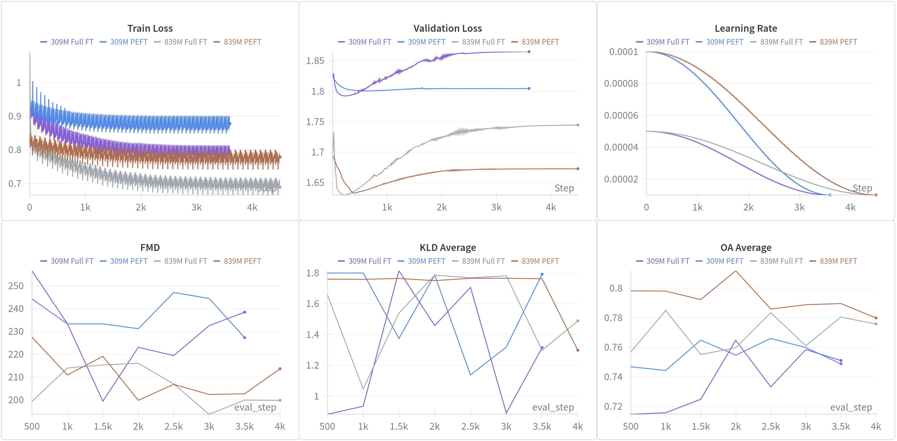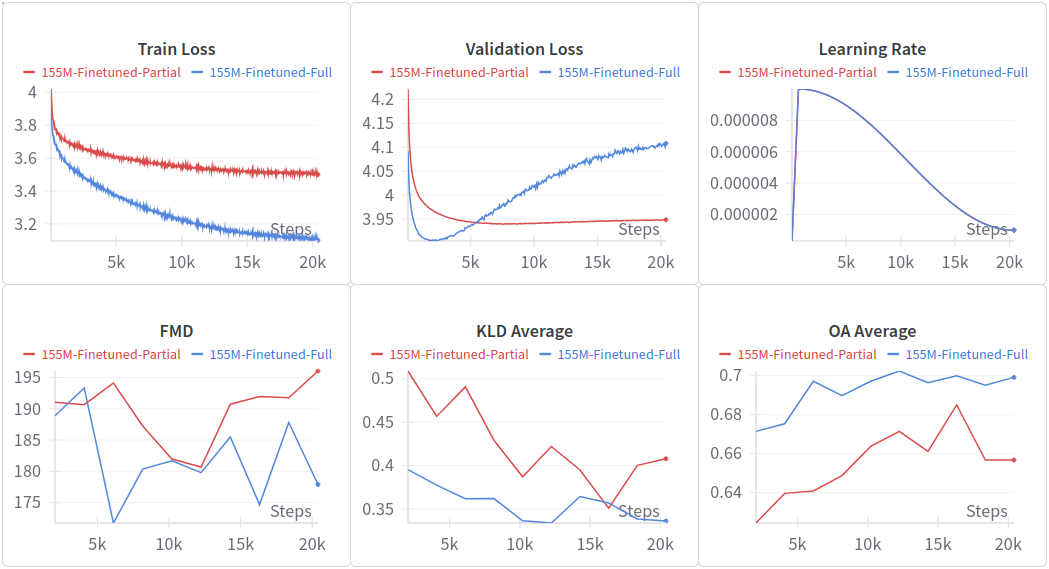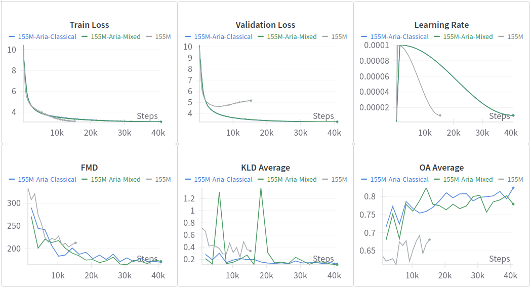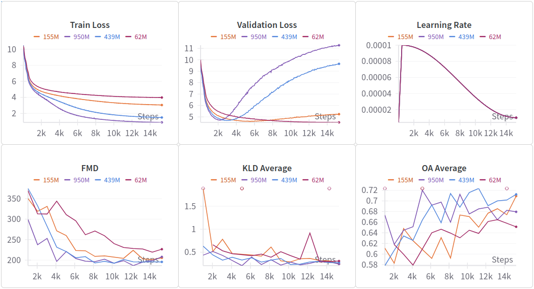 This tells you something crucial: find the sweet spot where your model has enough capacity to express patterns in your data without being so oversized that it memorizes. For the 80K Aria dataset, that sweet spot appears to be in the 950M range. A 155M model trained on the same data was close behind, suggesting the marginal benefit of going bigger is limited.