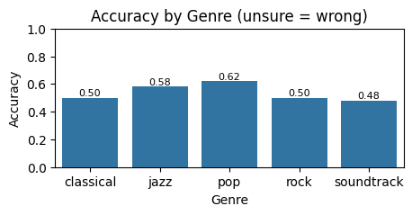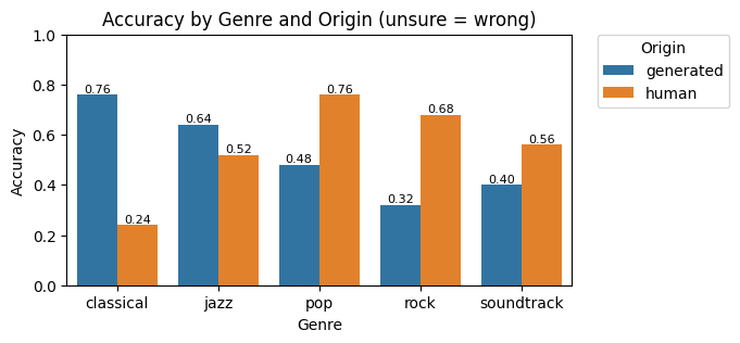 Accuracy of listener classifications broken down by genre, showing which genres the model fools most and least convincingly