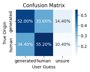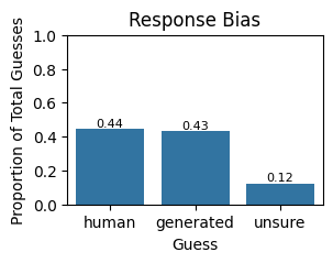 Humans don't classify randomly. They have biases, preferences, hunches. Some people might assume that anything unusual-sounding must be AI. Others might assume that complexity implies human authorship. Understanding these biases matters for interpreting what the 50% accuracy actually means. If people had a strong bias, 50% might actually represent strong model performance despite the bias pulling toward one label.