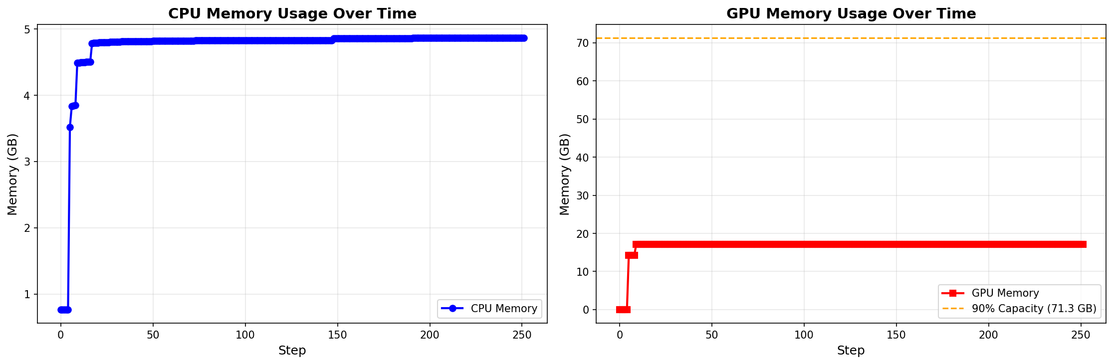 Memory usage graph showing CPU and GPU consumption remains stable at approximately 4.8 GB and 17 GB respectively across all experiments