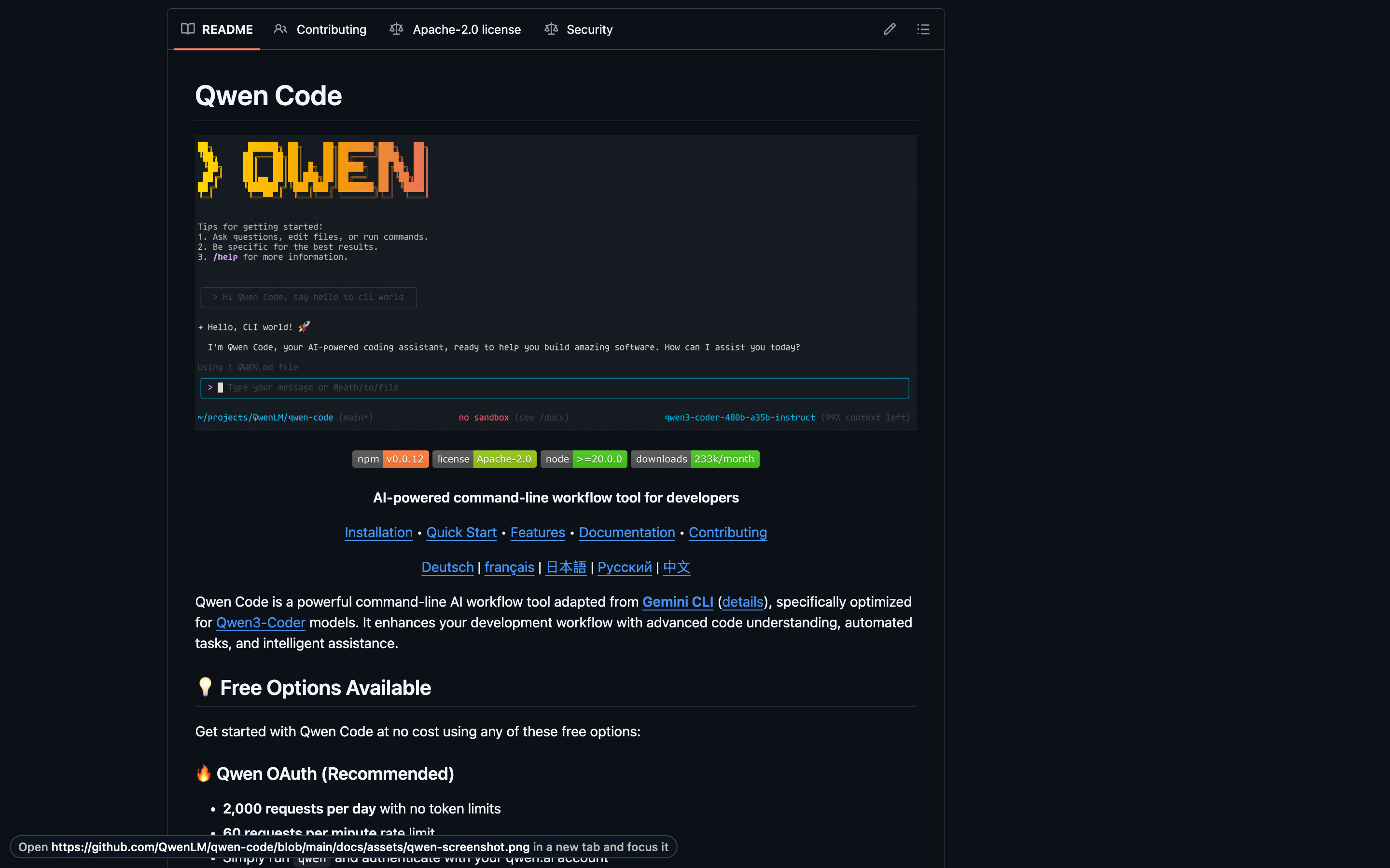 Qwen Code is a command-line AI workflow tool built on Gemini CLI, fine-tuned for Qwen3-Coder models. It streamlines development with advanced code understanding, intelligent editing, and automated workflows.