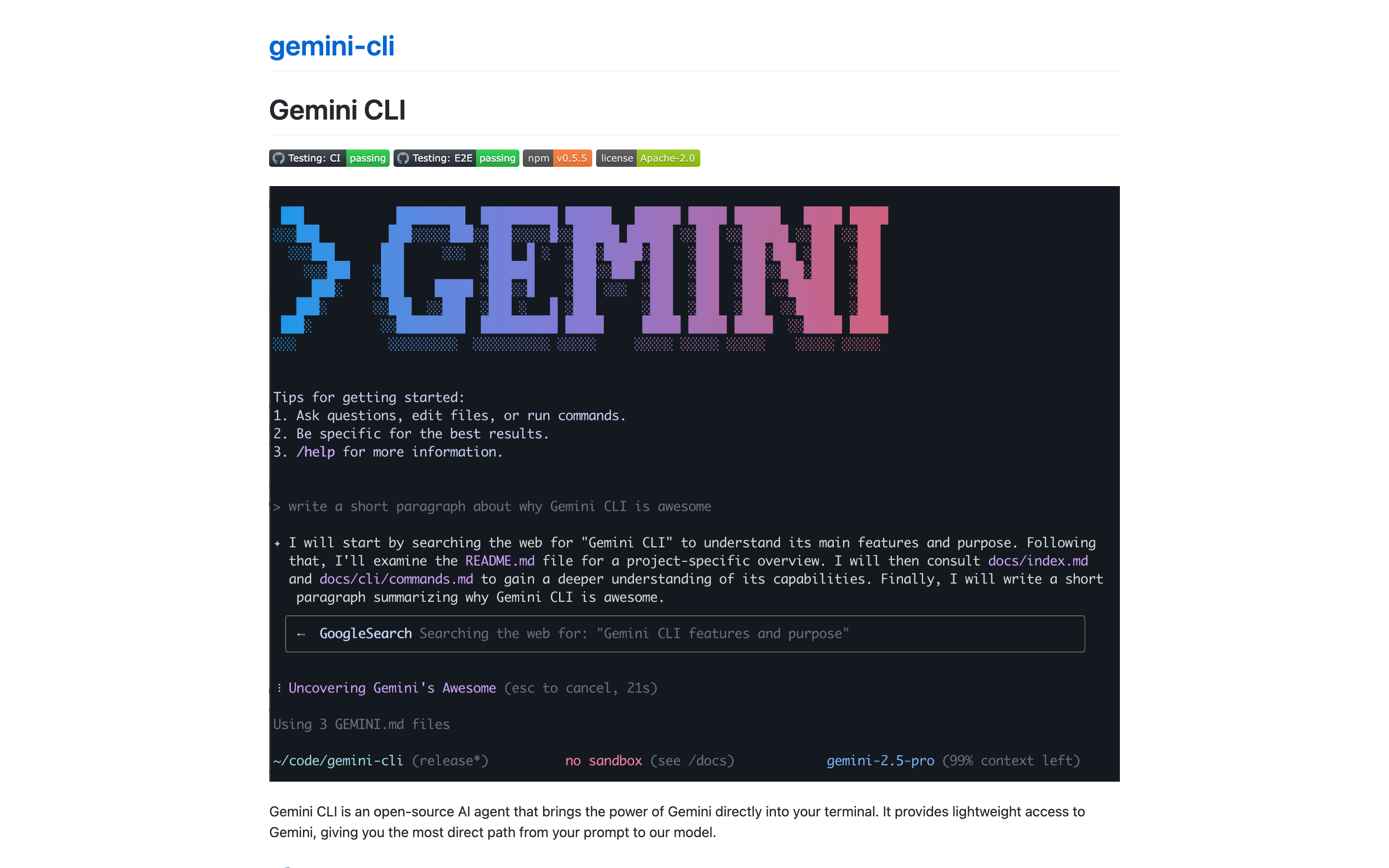 Gemini CLI is an open-source AI agent that brings the power of Gemini straight to your terminal. It offers a lightweight, direct way to interact with Gemini from the command line, making it ideal for developers who live in the shell.