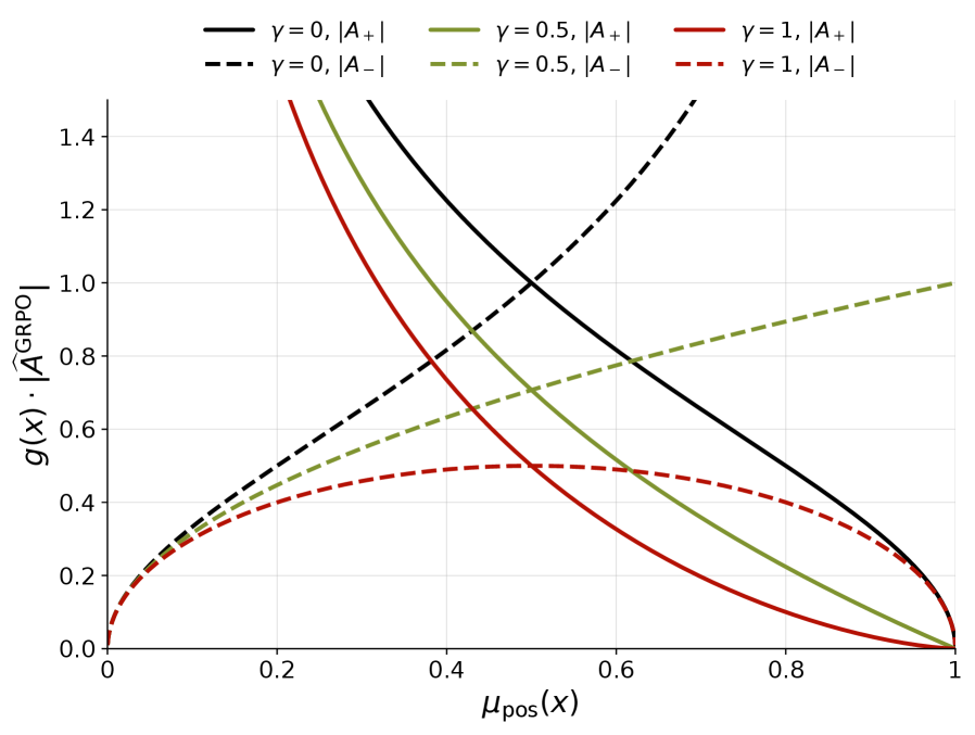 The modification is a difficulty-aware advantage scaling coefficient that multiplies the advantage function. High-probability solutions (which the policy already handles well) get downweighted. Low-probability solutions get preserved or even amplified. This does two things simultaneously: it reduces the gradient signal from easy-to-solve cases, and it protects the gradient signal from hard-to-solve cases.