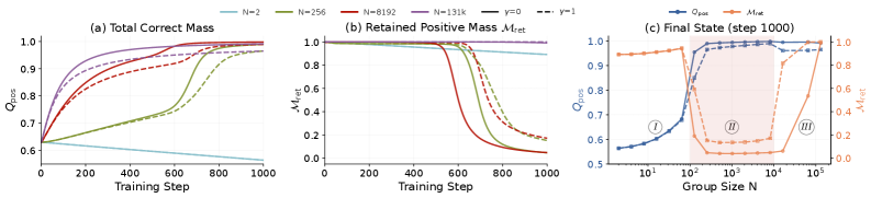 Here's why: at very small batch sizes (say, 4), groups rarely contain both correct and incorrect solutions, so the algorithm rarely gets an active learning signal. At very large batch sizes (1000+), batches contain almost everything, including rare solutions. But at intermediate sizes, something unfortunate happens. The batch is large enough to trigger learning (it contains mixed rewards) but small enough to have systematic blind spots (it misses rare solutions entirely).