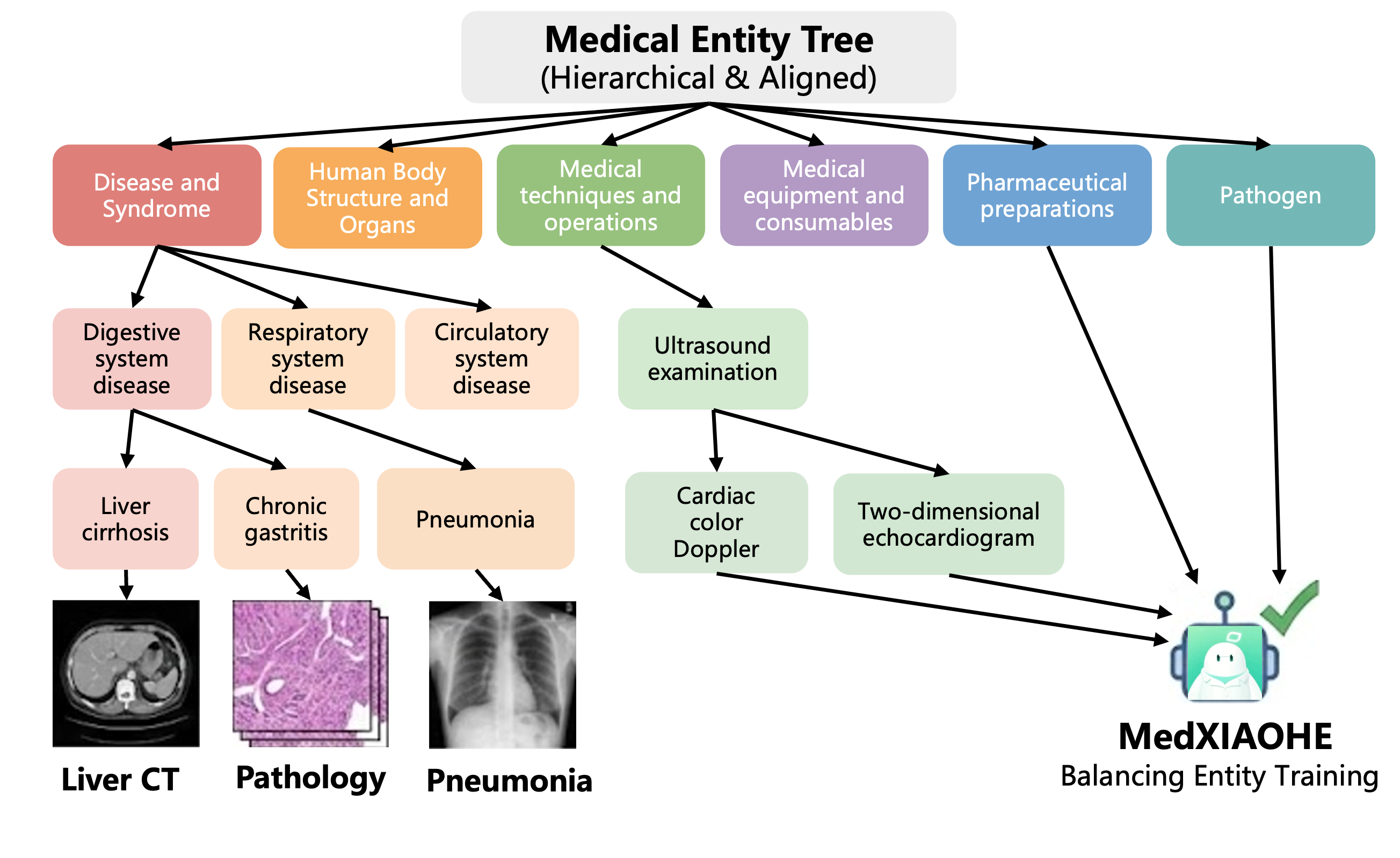 The entity-aware continual pretraining framework solves the knowledge breadth problem. Medical knowledge cannot be organized by treating all examples equally. Instead, the authors built a Medical Entity Tree, a hierarchical taxonomy organizing medical concepts into aligned categories.
