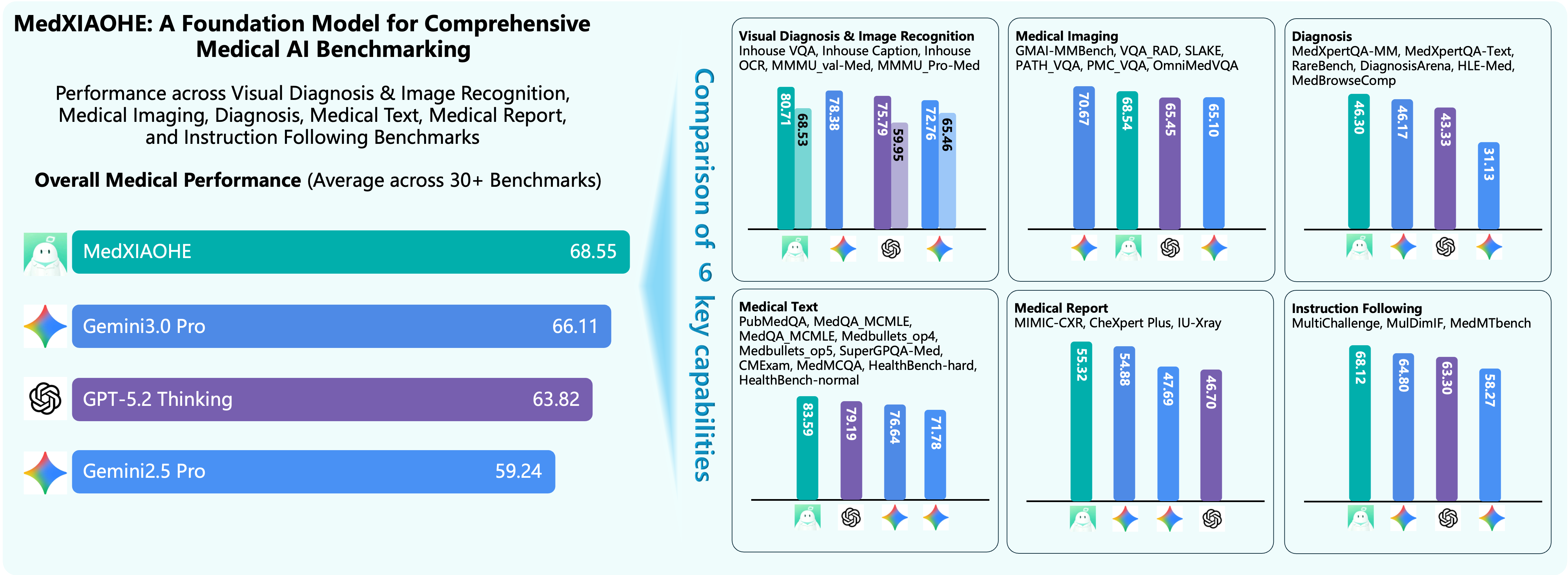 MedXIAOHE was evaluated across more than 30 benchmarks spanning diagnostic accuracy on diverse conditions, reasoning quality, tool usage patterns, uncertainty calibration, and report usefulness as judged by clinicians. Performance was compared against closed-source systems like GPT-4V and against specialized medical models.