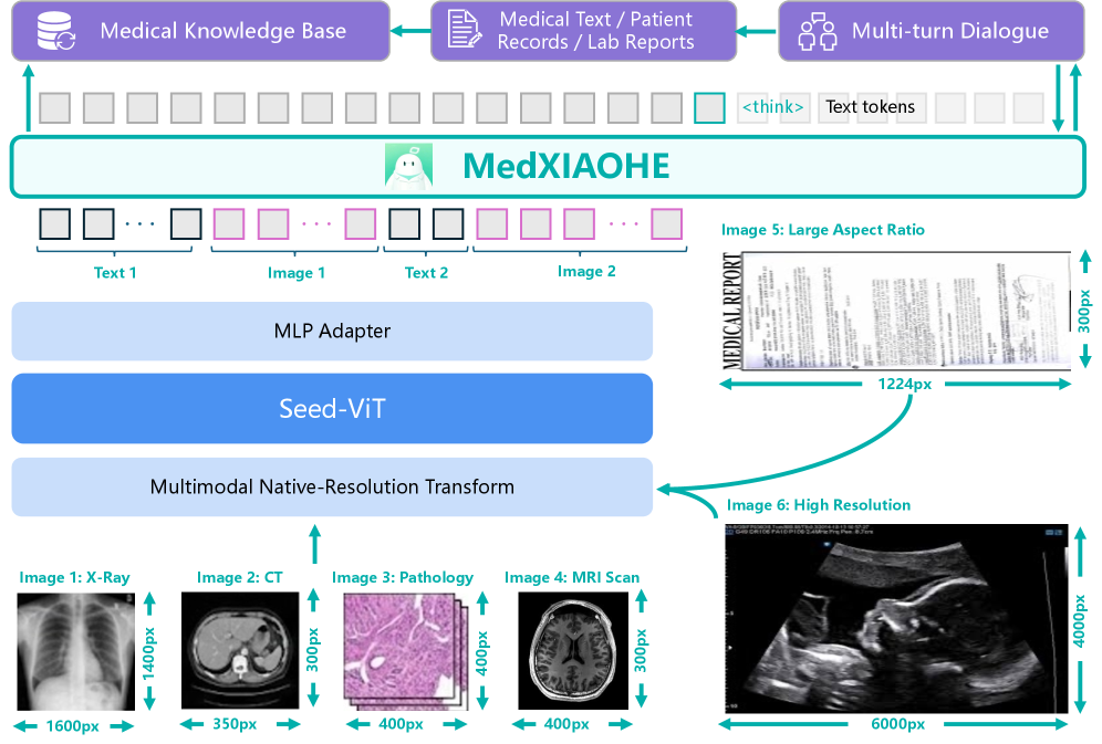MedXIAOHE addresses all four dimensions through a unified pipeline. The architecture itself is noteworthy: a Multimodal Native-Resolution Transformer that processes medical images at their natural resolution rather than forcing everything into uniform patches.