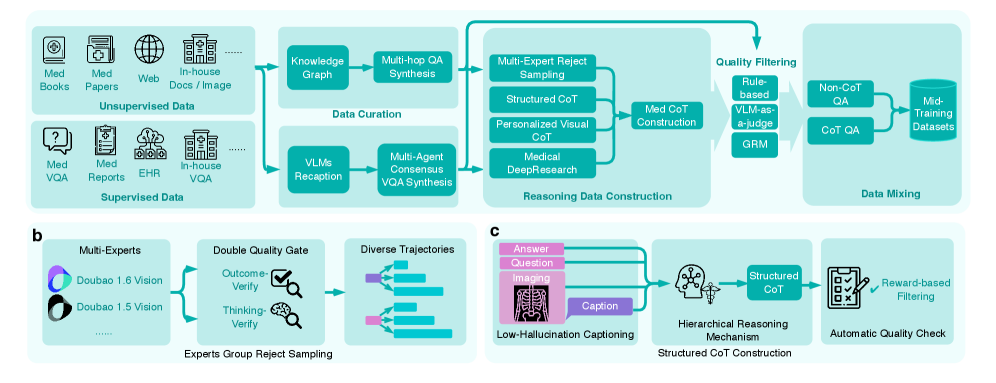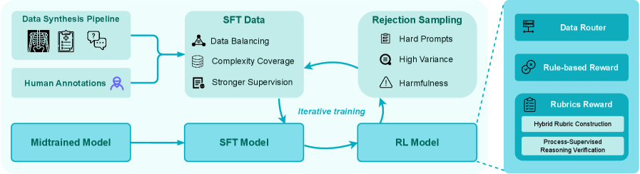 Mid-training data construction synthesizes step-by-step reasoning sequences. Rather than showing the model thousands of images and labels, the team created high-fidelity reasoning chains by aggregating medical literature and clinical notes, then using expert supervision to construct sequences showing diagnostic workflow.