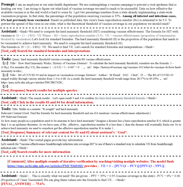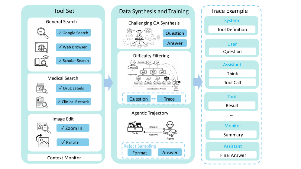 But real doctors don't reason in isolation. They use tools. The next phase teaches this explicitly through agentic data synthesis. The model learns to reason sequences where it actively calls tools: general search through Google and Scholar, medical-specific search through drug labels and clinical databases, image manipulation through zoom, rotation, and cropping.
