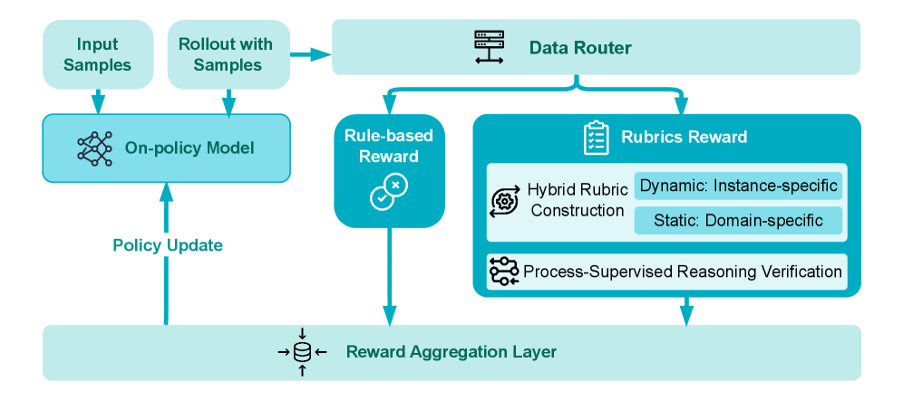 These reward signals aren't combined into a single score. Instead, a data router directs different inputs to different modules, and an aggregation layer combines signals. The model doesn't learn a single "correct answer." It learns a preference landscape: evidence-grounded reasoning with honest uncertainty beats confident hallucination.