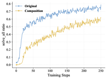 The results confirm the intuition holds at scale. Figure 2 visualizes the core finding: the solve_all ratio, which measures what fraction of test problems the model solves correctly, climbs faster and higher when trained on compositional prompts compared to the original dataset. This isn't marginal improvement, it's consistent across all model sizes tested.
