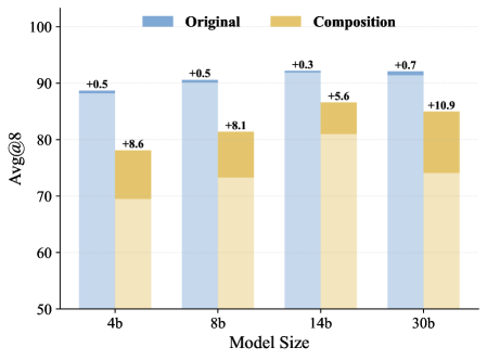 Average@8 accuracy on MATH500 and corresponding compositional test prompts across different model sizes.
