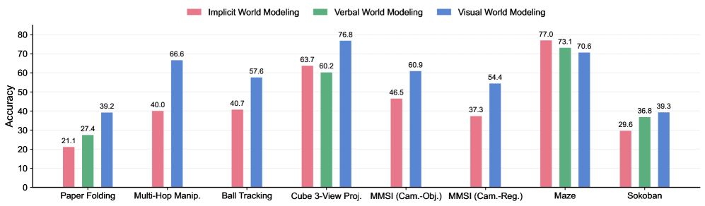 You might wonder whether the improvement comes simply from the visual model being architecturally different or having more capacity. But the experiments control for this. The same model gets access to visual generation in one condition and doesn't in another. The only difference is whether it can think in images.