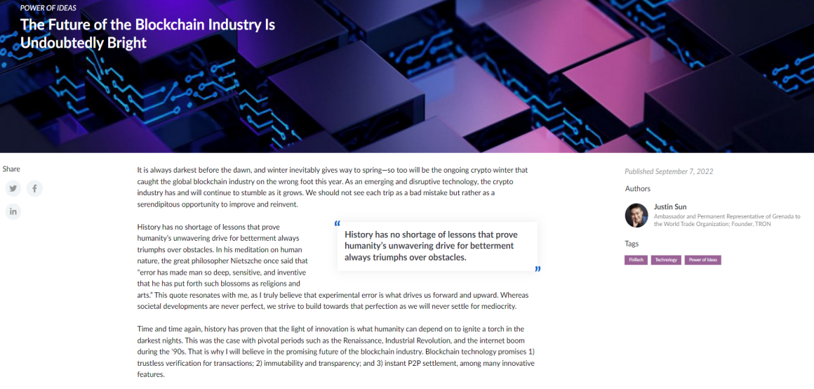 GENEVA, SWITZERLAND – Media OutReach – 15 September 2022 – Justin Sun, founder of TRON, published an article titled “The Future of the Blockchain Industry Is Undoubtedly Bright” on the website of the Milken Institute recently. “As an emerging and disruptive technology, the crypto industry has been and will continue to stumble as it grows,” Sun says in the article. However, “winter inevitably gives way to spring”, he adds, “the future of the blockchain industry is undoubtedly bright.”