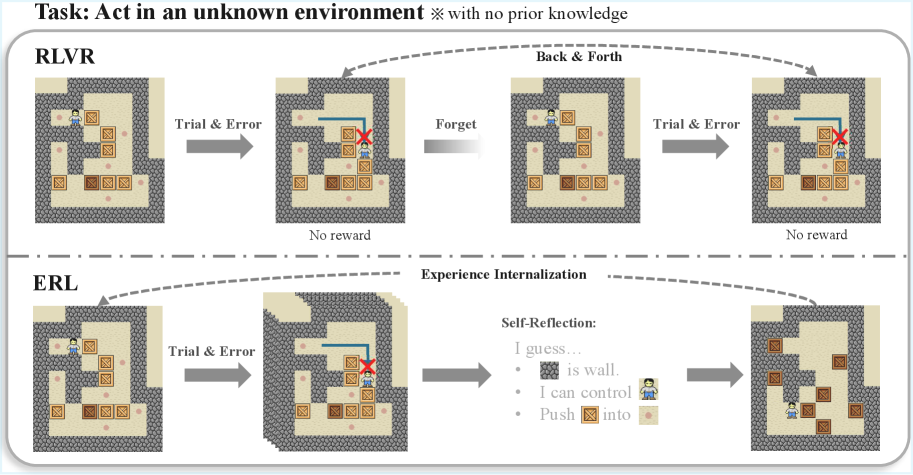 A comparison of learning dynamics in RLVR and ERL. RLVR shows repeated trial-and-error cycles driven by scalar rewards, with back-and-forth oscillation and no durable correction. ERL shows a structured experience-reflection-consolidation loop leading to stable improvement.