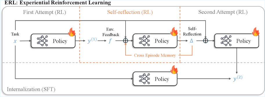 The core contribution of this work is a reconceptualization of what reinforcement learning feedback actually accomplishes. Instead of treating feedback as a direct correction signal, ERL treats it as a trigger for reasoning. The model explains what happened, uses that explanation to guide a refined attempt, and learns from the success of that attempt.