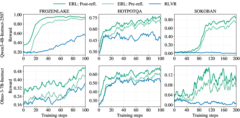 Final evaluation reward on FrozenLake, HotpotQA, and Sokoban. ERL consistently outperforms RLVR for both model architectures.