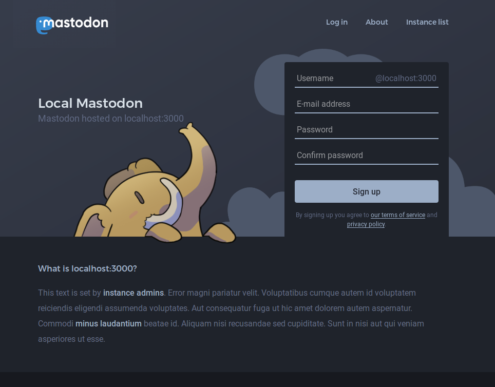 And as all good things come in threes, the landing page distributed along with the software itself — the instance frontpage if you will — has also been refurbished. Now that there is a project homepage to differentiate itself, the instance frontpage puts more effort into presenting a particular instance’s identity, rather than the underlying software. The name and the customizable description have a lot more prominence.