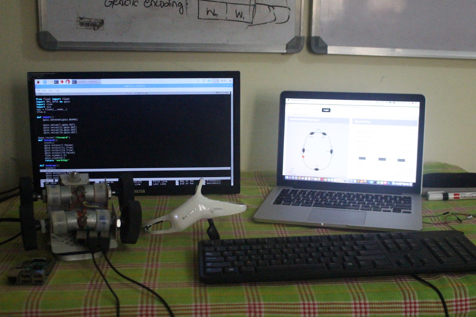 Here’s how we developed a Brain-Computer Interface(BCI) implementation to control a rover with just your thoughts, i.e., with a raw stream of real-time EEG data. A BCI is a device that translates neuronal information from the cerebral area of the brain into data capable of controlling external software or hardware such as a computer or a robotic limb. BCIs are often used as assisted living devices for individuals with motor or sensory impairments. BCIs are of two classes: Invasive methods and Non-Invasive methods. Invasive BCIs are electrodes that are implanted either inside the subject’s brain or on the surface of the brain through surgical means, for reading high quality signals, whereas generally Non-Invasive BCIs are electrodes that are worn over the surface of the head and placed along the scalp, to read feeble EEG signals and thus do not require surgery. EEG or ( measures voltage fluctuations resulting from ionic current within the neurons of the brain. electroencephalogram signals) Non-invasive EEG-based BCIs are portable, easy to use, and able to acquire signals in real-time, which is feasible to achieve brain-actuated control. For this project, we use a commercially available EEG-based BCI device called the Emotiv Insight. It provides 5-channels (i.e., 5 electrodes to pick up signals from the surface of head) which is sufficient for this build. Emotiv Insight, a portable EEG reader The Emotiv Insight connects to the computer via bluetooth, and is provided with a native API to access the EEG signals being read from the subject’s brain. 5 channels of EEG waves read from the test subject Using the API we can train the Insight to correspond or map the EEG data being read to the labels such as ‘Move Forward’, ‘Turn Left’ and ‘Turn Right’. For example, when training the Insight to learn the command ‘Move Forward’, we think about accelerating the rover, so that it corresponds EEG signals being produced at the time as the label ‘Move Forward’. Once the training for these mental commands is done, the device learns to recognise these commands when we are thinking about them. System Architecture We are going to use a very straightforward architecture, which is comprised of the four components described below. which is the Emotiv Insight. It picks up the EEG signals from the subject and sends them to the connected computer as raw vectorised data. The EEG device to connect with the Emotiv Insight via bluetooth and communicate through the Emotiv’s API. The API (which is built on JSON and WebSockets) provides access to EEG data and also supports training and recognition of mental commands. The documentation for the API can be obtained from the . The final code is provided and explained below, so we can skip documentation for now. A computer Emotiv Documentation page that listens to requests (i.e., commands such as ‘move forward’, ‘turn left’, etc.) from the computer and sends the corresponding signals to the rover, where these requests are acted upon. The actions are the movement commands for the rover. It is written in using the Flask web framework, and hosted in the rover’s Raspberry Pi computer. A Server Raspberry Pi 3 The Raspberry Pi not only makes for an extremely cheap Linux computer, it also makes for a excellent bridge between the language and robotics. Python programming , which is a very simple build comprising of a metallic body, four wheels, four electric motors, an H-bridge, portable phone battery, and a Raspberry Pi 3 computer. The main focus here is on the and the server code that goes in it. Each wheel is connected to its own motor and all the four motors are connected to the H-bridge. The H-bridge makes connections to the GPIO pins of the Pi which are controlled via the server by making requests by any remote device. A Rover Raspberry Pi Top and bottom view of the rover Talk is cheap. Show me the code. The codes below are available in a GitHub repo as well: [ ] prajwalgatti/EEG_Controlled_Rover Server Code This Python 3 script makes for the server code which is hosted on the Rover’s Raspberry Pi. It is meant to listen for, and receive commands to control the rover. from flask import Flaskimport RPi.GPIO as gpioimport time Let us go into detail about these libraries being imported. In line 1, we import . Flask is a web framework written in Python. Flask In line 2, we import . This package provides a class to control the GPIO (general-purpose input/output) channels on the Raspberry Pi. RPi.GPIO In line 3, we import the library, used here to add delays during the execution of the code. time app = Flask(__name__)tf=0.8 def init():gpio.setmode(gpio.BOARD)gpio.setup(7, gpio.OUT)gpio.setup(11, gpio.OUT)gpio.setup(13, gpio.OUT)gpio.setup(15, gpio.OUT) We create , an instance of class . app Flask Next, we have an function, which stands for initialisation. The init function sets up all of the GPIO pins that we are using. init() # Move rover forward@app.route(‘/forward’)def forward():init()gpio.output(7, False)gpio.output(11, True)gpio.output(13, True)gpio.output(15, False)time.sleep(tf)gpio.cleanup()return ‘moved forward’ # Pivot rover to the left@app.route(‘/pivot_left’)def pivot_left():init()gpio.output(7, True)gpio.output(11, False)gpio.output(13, True)gpio.output(15, False)time.sleep(tf)gpio.cleanup()return ‘pivoted left’ # Pivot rover to the right@app.route(‘/pivot_right’)def pivot_right():init()gpio.output(7, False)gpio.output(11, True)gpio.output(13, False)gpio.output(15, True)time.sleep(tf)gpio.cleanup()return ‘pivoted right’ Next, we define our forward, pivot left and pivot right functions. What these functions are going to do is initiate the proper changes in the GPIO pins to make the wheels go either forward, left or right, depending on our goals. Finally, after defining our functions, we call a quick , then ask the forward and reverse functions to run for 0.8 seconds. After this, we use to cease the pins from b