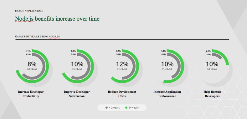 Node.js Emerging as the Universal Development Framework for a Diversity of Applications Last year and at the beginning of this year, we asked you, Node.js users, to help us understand where, how and why you are using Node.js. We wanted to see what technologies you are using alongside Node.js, how you are learning Node.js, what Node.js versions you are using, and how these answers differ across the globe. Thank you to all who participated. 1,405 people from around the world (85+ countries) completed the survey, which was available in English and Mandarin. 67% of respondents were developers, 28% held managerial titles, and 5% listed their position as “other.” Geographic representation of the survey covered: 35% United States and Canada, 41% EMEA, 19% APAC, and 6% Latin and South America. There was a lot of incredible data collected revealing: , ways of using Node.js, and deployment locations. Users span a broad mix of development focus used with Node.js. There is a large mix of tools and technologies — although many have been using Node.js less than 2 years. Experience with Node.js is also varied , being used at least half of their development time. Node.js is a key part of the survey user’s toolkit The report also painted a detailed picture of the types of technologies being used with Node.js, language preferences alongside Node.js, and preferred production and development environments for the technology. “Given developers’ important role in influencing the direction and pace of technology adoption, surveys of large developer communities are always interesting,” said Rachel Stephens, RedMonk Analyst. “This is particularly true when the community surveyed is strategically important like Node.js.” In September, we will be releasing the interactive infographic of the results, which will allow you to dive deeper into your areas of interest. For the time being, check out our blog on the report below and download the executive summary . here The Benefits of Node.js Grow with Time No Matter the Environment Node.js is emerging as a universal development framework for digital transformation with a broad diversity of applications. With more than 8 million Node.js instances online, three in four users are planning to increase their use of Node.js in the next 12 months. Many are learning Node.js in a foreign language with China being the second largest population outside of the United States using Node.js. Those who continue to use Node.js over time were more likely to note the increased business impact of the application platform. Key data includes: Most Node.js users found that the application platform helped improve developer satisfaction and productivity, and benefited from cost savings and increased application performance. The growth of Node.js within companies is a testament to the platform’s versatility. It is moving beyond being simply an application platform, and beginning to be used for rapid experimentation with . It is often times the primary focus for developers with the majority of developers spending their time with Node.js on the back-end, full stack, and front-end. Although Node.js use is beginning to rise in the Ops/DevOps sector and mobile as well. corporate data, application modernization and IoT solutions Node.js Used Less Than 2 Years, but Growing Rapidly In Businesses Experience with Node.js varied — although many have been using Node.js less than 2 years. Given the rapid pace of Node.js adoption with a growth rate of about 100% year-over-year this isn’t surprising. Companies that were surveyed noted that they were planning to expand their use of Node.js for web applications, enterprise, IoT, embedded systems and big data analytics. Conversely, they are looking to decrease the use of Java, PHP and Ruby. Large Mix of Technology and Tools Used Alongside Node.js for Digital Transformation Modernizing systems and processes are a top priority across businesses and verticals. Node.js’ light footprint and componentized nature make it a perfect fit for microservices (both container and serverless based) for lean software development without the need to gut out legacy infrastructure. The survey revealed that 47% of respondents are using Node.js for container and serverless-based architectures across development areas: 50% of respondents are using containers for back-end development. 52% of respondents are using containers for full-stack development. 39% of respondents are using containers for front-end development. 48% of respondents are using containers for another area of development with Node.js. The use of Node.js expands well beyond containers and cloud-native apps to touch development with databases, front-end framework/libraries, load balancing, message systems and more. And for developers of all focus areas, Node.js has versatile usage. Amazon Leads Serverless Technology and Node.js 68% of survey respondents who are using Node.js for serverless are using Amazon Web Services for production. 47% of survey respondents using Node.js and serverless are using Amazon Web Services for development. Developers who use Node.js and serverless used it across several development areas with the most popular being: back-end, full stack, front-end and DevOps. The Big Data Benefit Revenues for big data and business analytics are set to grow to more than . Vendors in this market require distributed systems within their products and rely on Node.js for data analysis. $203 billion in 2020 The survey revealed that big data/business analytics developers and managers are more likely to see major business impacts after instrumenting Node.js into their infrastructure with key benefits being productivity, satisfaction, cost containment, and increased application performance. Node.js Grows in the Enterprise With the creation of the in 2015, there has been an increase of enterprise development work with Node.js. The Long-Term support plan provides a stable (LTS) release line for e