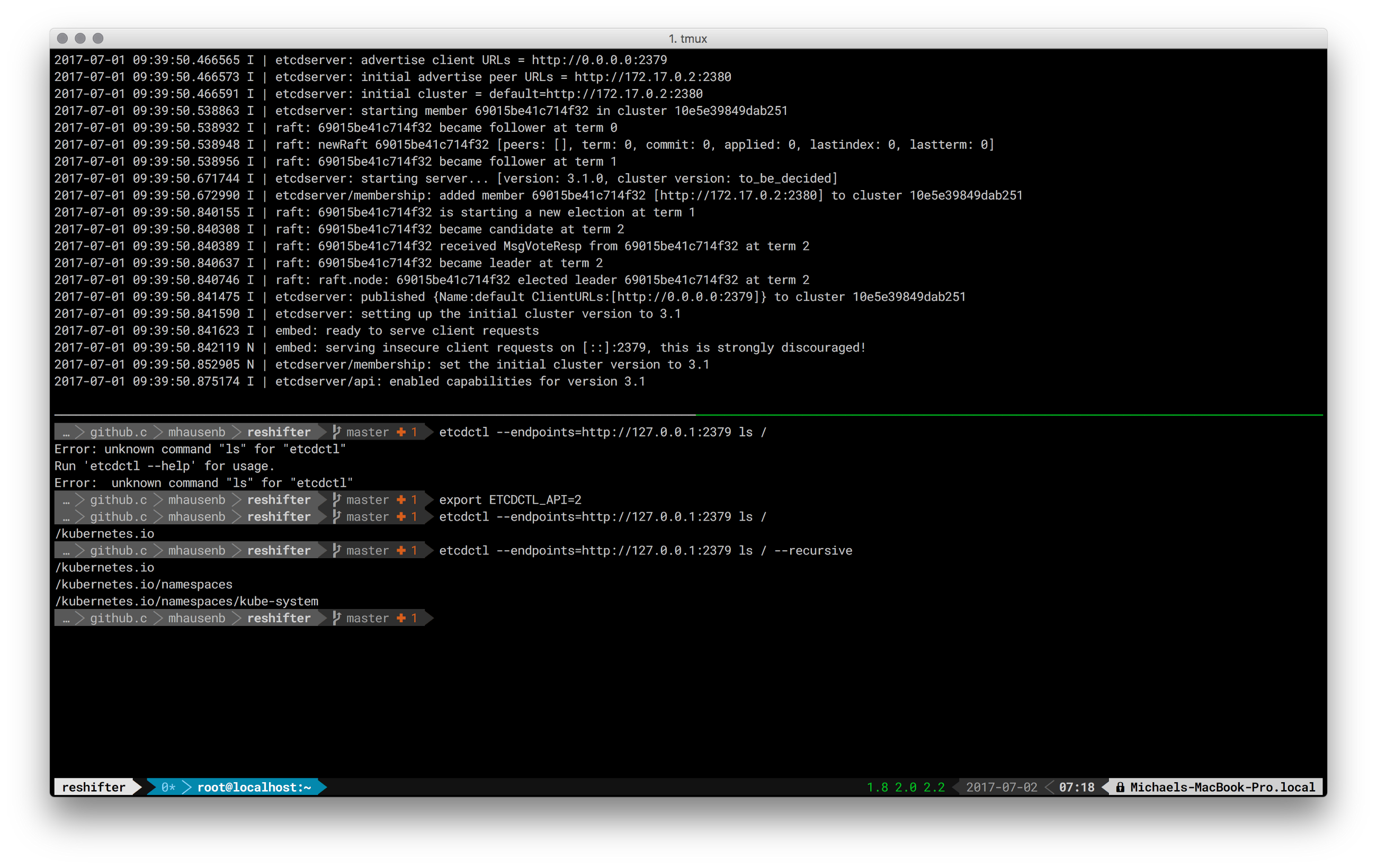 ETCDCTL_API=3. This unremarkable switch causesetcdctlto switch from talking v2 to v3. Runetcdctlbefore and after setting the env variable and compare the commands you’ve got available, for exampleget/setin v2 vs.get/putin v3 (see also the screen shot at the top of this post, showing thatlsis only available in the v2 API). - In an etcd3 server, the v2 and v3 data stores exist in parallel and are independent, see also the terminal session, below.