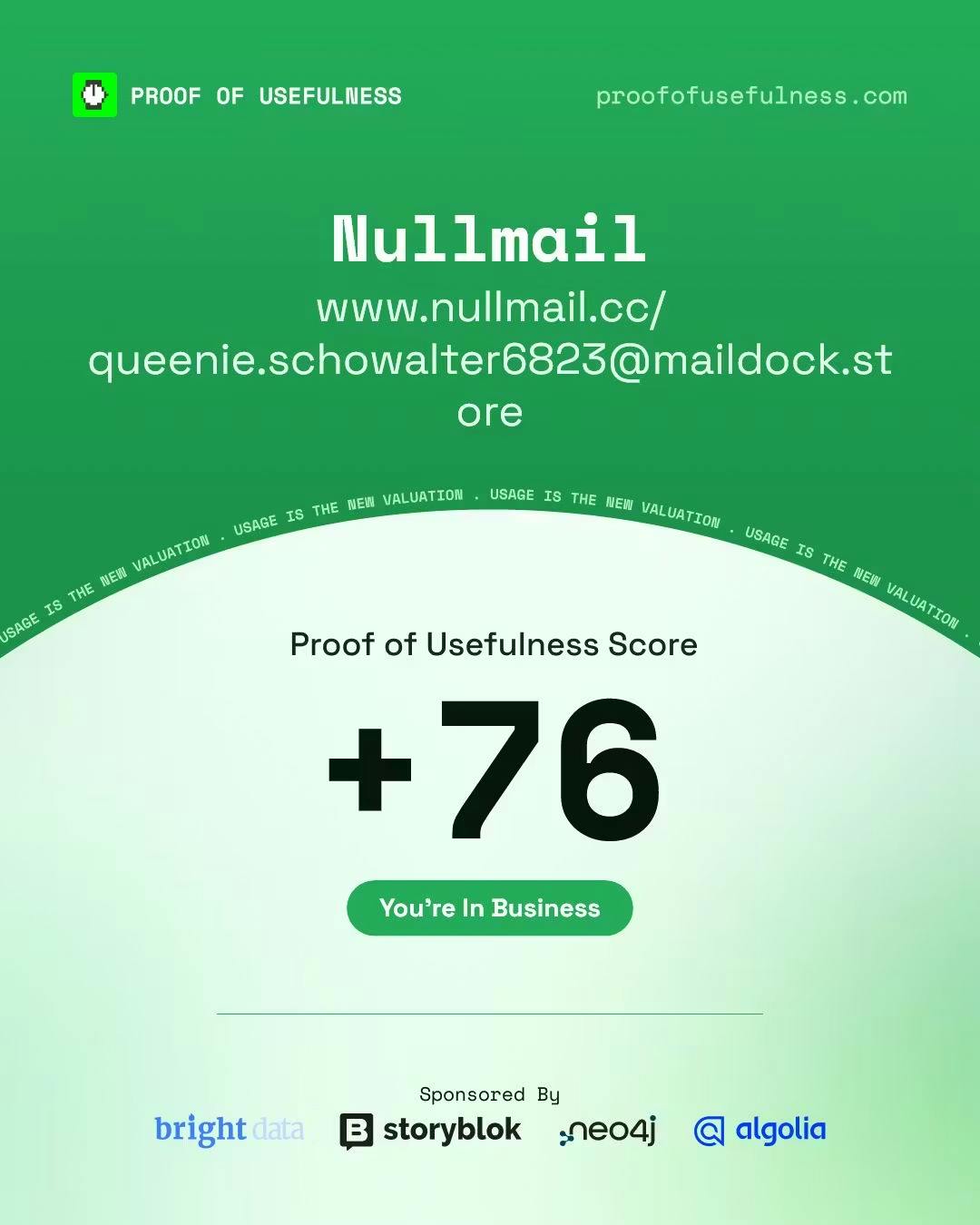 I recently submitted Nullmail to Proof of Usefulness, and it scored +76 - officially “in business”! Here’s why this project matters. Nullmail Nullmail Proof of Usefulness +76 What It Is Nullmail is a verifiable, open-source privacy tool with active development and organic traction. While early-stage (approx. 10,000 monthly inboxes), the project's 'privacy-first' architecture is validated by its open GitHub repository and recent 'battle-testing' against domain flagging (Cloudflare). It effectively solves a specific problem (disposable email) without data collection, positioning it as a high-utility tool in a niche market. The score reflects its functional utility and transparency, balanced against its small scale and lack of revenue compared to established brands. Who It’s For Privacy-conscious users who want to keep their real email private Developers, QA engineers, and testers needing temporary inboxes for account verification and workflow testing Privacy-conscious users who want to keep their real email private Developers, QA engineers, and testers needing temporary inboxes for account verification and workflow testing Description Nullmail is an open-source disposable email service that provides instant, anonymous inboxes with automatic expiry and zero tracking. It helps users protect their privacy, avoid spam, and quickly verify accounts without exposing their real email address. Built with a minimal, privacy-first architecture, it prioritizes usefulness over growth or data collection. Audience Reach Because the project is privacy-first and does not use analytics or tracking at all, exact user numbers are unavailable. However, roughly 10,000 disposable email addresses are generated monthly, indicating consistent active usage. Target Users People who want to protect their privacy online, avoid spam during signups, and developers or testers who need temporary email inboxes for account verification and testing workflows. Technologies Other, SvelteKit (TypeScript/JavaScript) frontend and server framework, Supabase for backend services and storage, ForwardEmail for email infrastructure, and Vercel for deployment and hosting Traction Evidence Google Search Console reports approximately 2000 monthly impressions and 500 clicks from organic search queries related to temporary email services. Combined with ~10,000 generated inboxes per month, this indicates steady real-world usage without relying on tracking or analytics. Open Source Check out the code here: https://github.com/gkoos/nullmail