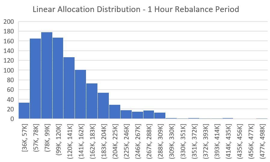 In our previous studies, all of the were run with an even distribution of assets. This means if a portfolio of 5 cryptocurrencies was allocated, the selected allocation for each asset was 20%. During rebalances, each asset would be realigned to this allocation. backtests This study is putting distribution models to the test. We will examine 3 different distributions to determine the optimal allocation strategy. These allocation strategies will be the following: Even Linear Exponential Backtest Design & Setup In order to evaluate each allocation strategy, we performed backtests over historic data. This allows us to create a simulation of how well a strategy would have performed in the past. The following constraints were used when performing each backtest. Trades & Data Market data was collected from May 4, 2017 to May 3, 2018. This data was used to calculate the price of trades as they would have happened at that time. The trading path between each asset was performed by first trading to BTC. This simplifies the path across exchanges which may have different base pairs. Each trade was simulated using a .25% trading fee. Assets & Initial Conditions Every portfolio in this study consists of exactly 10 randomly selected assets. After each backtest, a new random group of 10 assets is selected for the next backtest. This process is completed 1,000 times for each strategy type and rebalance period. The complete list of assets which were included in the study can be found in our backtest tool. At the start of each backtest, the portfolio is seeded with a $5,000 initial investment which is allocated across the assets. The rebalancing method used is outlined in our previous article. A more in depth discussion of the backtest procedure and study setup can be found in our previous article: _The intention of this study is to paint a fair picture of how rebalancing as a strategy stacks up to HODLing. In order…_blog.shrimpy.io Rebalance vs. HODL: A Technical Analysis Even Allocation Distribution This distribution follows an allocation of 10 percent for each asset. Even distribution means that each asset holds the same weight in the portfolio. A portfolio of 10 assets would result in each asset holding exactly 10% weight in the portfolio. Whenever the portfolio is rebalanced, trades are made to realign the portfolio to match these desired allocations. This group compares the performance of evenly distributed portfolios which contain 10 assets, but differ by rebalance period. Each histogram incorporates 1,000 backtests, where the x-axis is the value of a portfolio after 1 year which had an initial investment of $5,000. The y-axis is the number of backtests which fell into the portfolio value buckets that are defined on the x-axis. (Example: A backtest was run with a rebalance period of 1 hour and 10 evenly distributed assets in the portfolio. The results of a backtest was $200k after one year. This would mean you add a 1 to the bottom right chart in the x-axis bucket which has the range of $195k to $214k. This process is then repeated until 1,000 backtests have been run.) These values represent the median portfolio value in USD, 1 year after an initial investment of $5,000. Each value corresponds to their respective histogram displayed above. Evenly distributed portfolios presented returns that ranged from a $40k median with HODL to a $123k median through rebalancing every hour. In addition to a higher median, rebalancing more frequently also presented a better spread. While the value of portfolios which used the HODL strategy were largely concentrated on the lower end, as observable in the above histograms, frequent rebalances improved the spread by distributing results over a wider range of values and higher performing portfolios. Not only did the median 1 hour rebalance period beat the median hodl, the worst performing portfolio out of over 1,000 backtests in the 1 hour rebalance strategy group beat the median HODL portfolio. After 1 year, evenly distributed portfolios which rebalanced hourly had a return of 2,360%. Linear Allocation Distribution This distribution follows an allocation of 1, 3, 5, 7, 9, 11, 13, 15, 17, 19 percent for each asset. Linear distributions still have a total sum of percentages that equal 100%, but the weights for each asset is uneven. The method in which they are uneven is linear. Since linear can have numerous meanings, we defined a portfolio with 10 assets to have a linear distribution of 1, 3, 5, 7, 9, 11, 13, 15, 17, 19 percent per asset. Whenever the portfolio is rebalanced, trades are made to realign the portfolio to match these desired allocations. This group compares the performance of linearly distributed portfolios which contain 10 assets, but differ by rebalance period. Each histogram incorporates 1,000 backtests, where the x-axis is the value of a portfolio after 1 year which had an initial investment of $5,000. The y-axis is the number of backtests which fell into the portfolio value buckets that are defined on the x-axis. (Example: A backtest was run with a rebalance period of 1 hour and 10 linearly distributed assets in the portfolio. The results of a backtest was $200k after one year. This would mean you add a 1 to the bottom right chart in the x-axis bucket which has the range of $183k to $204k. This process is then repeated until 1,000 backtests have been run.) These are the median portfolio values for each set of backtests which are detailed in the histograms above. The results for a linear asset distribution presents a decline in returns over 1 year when compared to even distributions. The median values saw a decrease ranging from $2k for portfolios which used the HODL strategy, to $8k for portfolios which performed rebalances every 1 hour. We also see from the histograms that linear asset distributions decreased the spread of the results. Instead of a smooth curve, results aggregated at the lower end of this spread. This suggests that not only the med