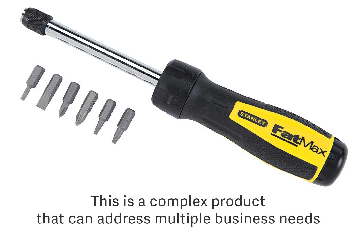Though there is a tendency to use the terms interchangeably — unless of course, you are a product marketer who should know better — there is an important distinction to be made between a product and a solution that should be understood and respected. This distinction affects the ways that employees of all stripes think about the organisation, the work that it does and the outputs that it generates, as well as the ways that the organisation is perceived by its customers. “ The Treachery of Images ” (1928–29), René Magritte’s famous take on the difference between a product and a service What’s a product ? A product is a good or service that corresponds to a unique company offering (equipment, software package, consulting offering, etc.) that has typically gone through a formal process for development and market introduction and usually has a proprietary name (often with a trademark or ™ or ® symbol). 1 A product can be either a good or a service or a combination of the two. In fact, more and more of what were previously considered goods under a strict product definition are being enhanced with services, though ultimately they remain a product. For our purposes, we’ll use the catch-all term “product” to refer to goods and services, as well as offerings that combine the two. There are formal rules, captured in corporate style guides, around the proper usage of a product name in all electronic and print communications. The use of a trademarked name as a verb or an adjective is the kind of thing that gives marketers nightmares. Where the possibility of a registered trademark for a product is not possible due to the use of a word or concept deemed too generic, a service mark (represented as “sm” beside a logo) may be used. 2 This screwdriver comes with multiple options. It could be part of multiple solutions. Though it takes the form of a service that is provisioned and interacted with over the Internet, Amazon Elastic Compute Cloud™ (aka EC2) is an example of a product. Characteristics of Products Typically trademarked in countries where the product is offered A unique name: a) core product and b) pre-defined optional capabilities / characteristics A defined/standardised feature set: a manufacturer’s suggested retail price or a “street” price A published price: there is low(er) risk since it was addressed during productization. The product can be delivered to multiple customers. A defined delivery model: Providing it to one customer does not prevent another from also purchasing the same product Repeatable: 3 The product’s core functionality is documented using generalized terms Documentation: the product can be compared with competitor’s offerings using a range of variables, from basic info such as price per unit to complex info such as system requirements that may be a specific limitation of a product Competitors: requirements for using the product are clearly defined. The product has been tested with required dependencies in place and its proper functioning in such circumstances is generally assured by the vendor Defined dependencies: What’s a solution ? Whereas a product has the potential of doing something, a is the of a product to a industry need or business . Note the word . The other key concepts here are and , from which the word is derived. solution application solve specific problem specific application solve solution When paired with a screw (another product) and a carpenter (a service), the screwdriver is part of a solution for building a home. It is generally understood that a solution will provide ongoing value to a customer. While there may be one-time-only events involved in its delivery to the customer — such as installation and configuration — that are similar to what are observed with more traditional notions of a product, these events are in the service of an ongoing relationship between the customer and the organization. These activities may also be repeated in whole or in part as the customer’s business needs changes, as it adds employees that interact with the solution, as the product component of the solution wears out, etc., or as the organization produces revised versions of the product that require subsequent integration with and adaptation to the customer’s operations. 4 In order for a solution to support an ongoing relationship with the customer, it needs to be designed and built with an eye to the future, with the ability to grow, evolve, and meet changing needs. In return for this ongoing value creation for the customer, the organization will levy ongoing fees — recurring revenues from its perspective — and enter into a longer-term agreement, typically measured in years, formalized as a service contract. Characteristics of Solutions However standard product features used in a solution are turned on or off, and/or are modified relative to their standard functionality Based on a standard product: These customizations are a function of one or more of the following: Industry, market / geography, organization size, expressed in terms of employees or geographical coverage), business function, and/or customer’s unique characteristics and requirements One or more significant customizations. Possibly integrate third-party offerings, professional services component, project management component, implementation calendar Optional characteristics: can be based on a combination of volume, list price, and customization work Non-standard pricing: revenue timing is different as well; delivery milestones come into play Revenue recognition is specific to the solution: Higher risk New documentation is produced Changes to documentation: From the perspective of marketing to prospective customers, ‘solutions’ are positioned at the level of the common challenges that are faced by organizations operating in a given industry or by the functional departments within them. As a result, the Solutions sections of websites are divided 