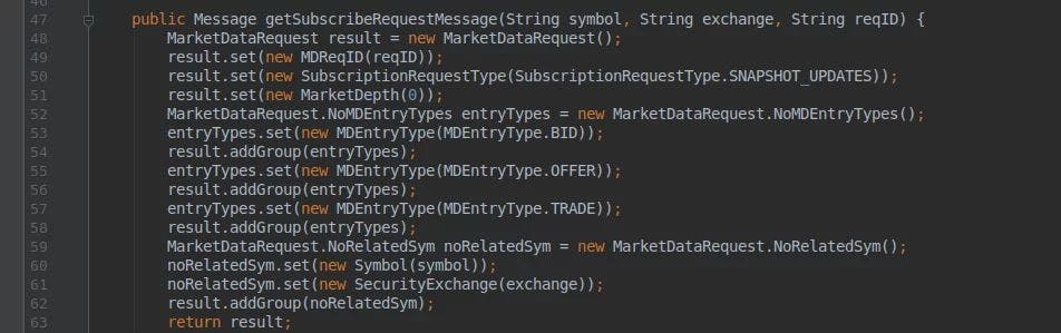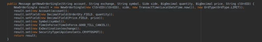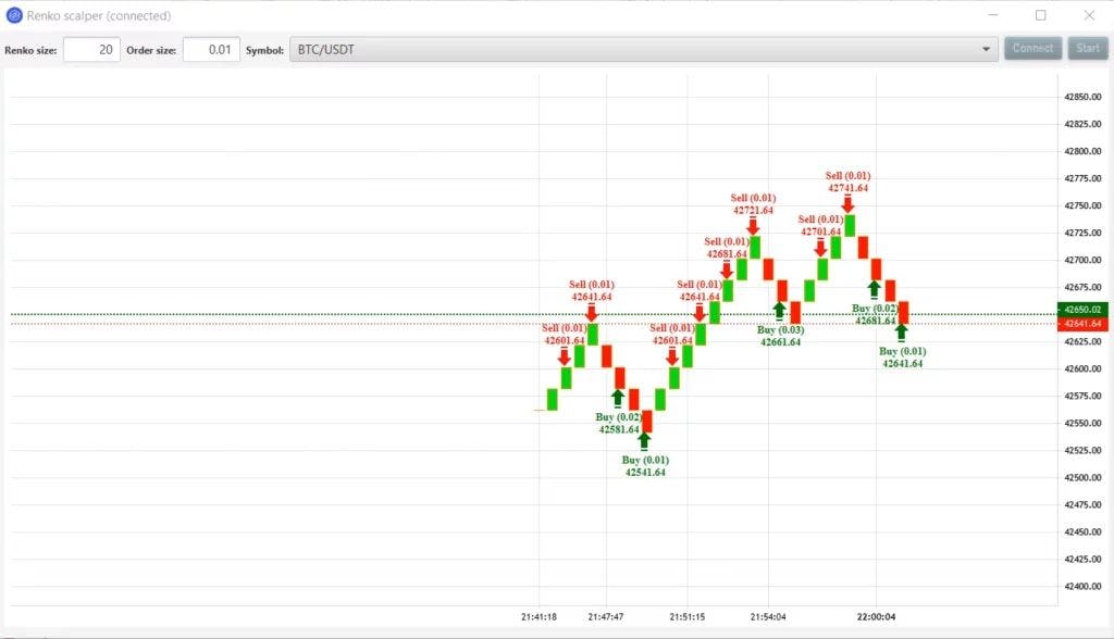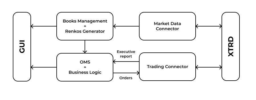 In this article, we would like to demonstrate how to build a small yet powerful scalping application that trades on the leading cryptocurrency exchange – Binance. The bot will be connected to Binance through XTRD FIX API to receive real-time normalized market data and to place/cancel orders. You can reuse this in your projects for free. source code Disclaimer: the bot is not a ready-to-use solution because it lacks risk controls and proper positions management. Although our R&D shows promising performance, do not expect to achieve the same results. Before we dive into the technical part, it’s worth explaining the logic behind the given trading bot. Scalping is a momentum-based trading style where positions hold for minutes or even seconds and then sell for profit (or small loss… a sacrifice to Mr. Market). When performed manually, it requires self-discipline, the ability to handle stress, make quick decisions, and act accordingly. Renko chart is one of the technical analysis tools that help reduce market noise and identify market trends more precisely. One of the authors of this article was introduced to Renko about 15 years ago and fell in love with it. To construct a single brick on a chart we should perform several simple steps: Define a brick size e.g. 10 points Define the price type to track. It can be bids, asks, trades, an average between the bid and ask, etc. Start tracking prices in real-time If the price changed more than 10 points, then form a new Renko brick in the corresponding direction. It is possible that the single price change can form more than one Renko brick. Here is our trading logic: Wait for a new Renko brick to be formed If it is an UP brick, then place a limit order to SELL with a price at the level of UP + 1 brick If it is a DOWN brick, then place a limit order to BUY with a price at the level of DOWN – 1 brick Continue monitoring the market for changing course or for execution If a newly formed brick changed its direction (this means that the price changed at least 2x of a brick size in the reverse direction), we should cancel our existing limit order and place another one with a new price and reversed direction. If the market moved in the direction we predicted, then our order gets executed and we should start over. Simply put, it is the good old “buy low, sell high” principle computerized and applied to crypto markets through XTRD FIX API. The bot itself contains several main components: Market data connector Trading connector Market data processor/Renko generator Simple OMS/EMS syste To make this technical-enough material more fun, we decided to build a small user interface to plot Renkos bricks and executions. Since all high-level details of implementation were discussed, let’s get started with the implementation part. To build Renko charts we need to establish a connection to a service called XTRD MD Feeder. It is responsible for disseminating real-time normalized market data from Binance (and other crypto exchanges) using FIX protocol. In comparison with WebSockets, FIX is faster and more reliable because it runs on top of a pure TCP/IP stack and has no additional intermediary layers. Using FIX protocol, you can easily subscribe to receive updates for one or many trading instruments available on Binance such as BTC/USDT, ETH/USDT, and so on. It is possible to specify what sort of information you’ll need – bids, asks, and/or trades. Another big advantage is that market data itself comes in incremental updates. This means that you receive only actual changes of the entire orders book (like 3-4 levels) but not a full book every time. This is not a big issue with Binance which already streams data as a delta (difference between the previous and current state) but can be extremely helpful with other crypto exchanges XTRD supports. There are three major messages defined by FIX standard and implemented inside XTRD that help manage your crypto market data streams – MarketDataRequest, MarketDataSnapshotFullRefresh, and MarketDataIncrementalRefresh. As it is easy to understand from their names, MarketDataRequest is used to manage your subscription (start or stop data streams), MarketDataSnapshotFullRefresh is used by the server to transmit the entire book, and MarketDataIncrementalRefresh is sent by the server when data (price or side) in the particular orders book changed. The market data management workflow is simple – once the application established a connection to XTRD OEMs over the FIX, it sends MarketDataRequest to subscribe to all updates on BTC/USDT (or another selected symbol) on Binance. If the request was successfully processed, XTRD OEMS for digital assets trading responds with a MarketDataSnapshotFullRefresh message that contains all levels for BTC/USDT orders book. The application uses this data to initiate the book and starts waiting for incoming MarketDataIncrementalRefreshes that carry small (and sometimes not very small) delta changes. These changes have to be applied to the book (delete levels, update sizes on a particular level, add new prices). Once a book is updated, the component responsible for Renko’s generation will check if the conditions to create a new brick are met or if the price is still within the interval. Now, when we have a working market data connection and Renkos charts, it’s time to start trading on Binance using FIX API. FIX specification contains plenty of different messages (commands and responses) that cover pretty much everything in a typical trade lifecycle starting from initiation to ending with trade confirmation and settlement. XTRD OEMS system allows managing orders (get all, place, cancel, replace) and viewing positions through the unified FIX API. When it comes to trading, there are three major messages – NewOrderSingle, OrderCancelRequest, and ExecutionReport. NewOrderSingle is used to initiate an order. The message allows specifying different order characteristics, such as side (e.g.