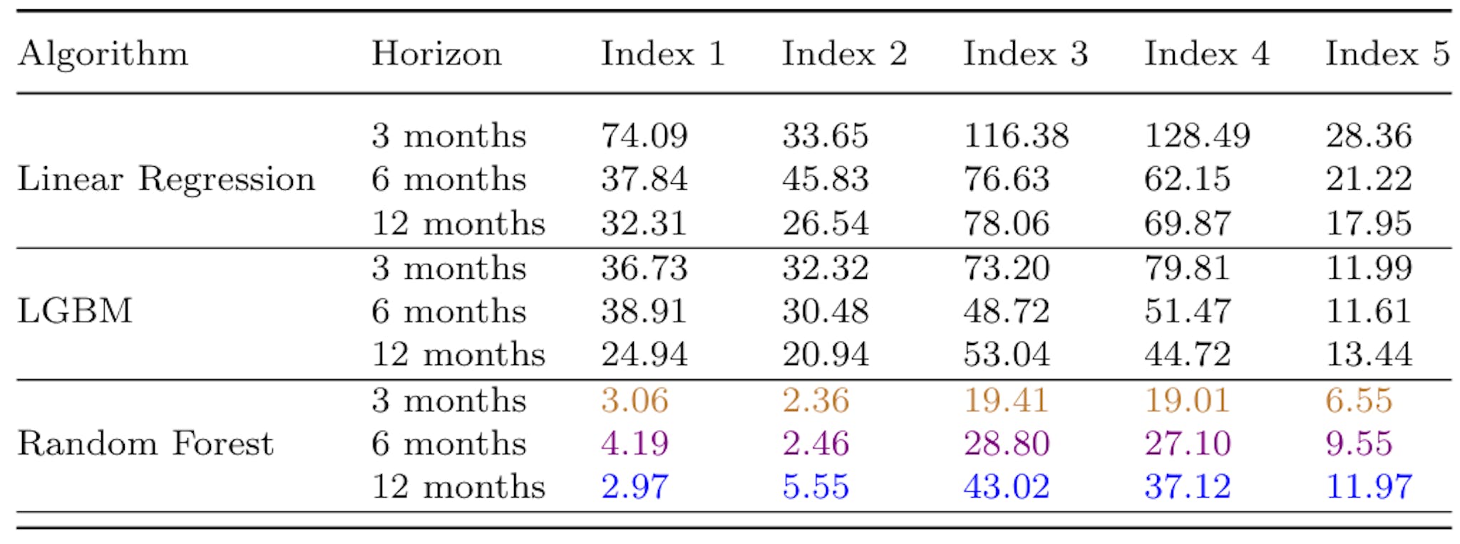 Table of Links Abstract and 1. Introduction Abstract and 1. Introduction 2 Related Work and 2.1 Technology Convergence Approaches 2 Related Work and 2.1 Technology Convergence Approaches 2.2 Technology Convergence Measurements 2.2 Technology Convergence Measurements 2.3 Technology Convergence Models 2.3 Technology Convergence Models 3 Data 3 Data 4 Method and 4.1 Proximity Indices 4 Method and 4.1 Proximity Indices 4.2 Interpolation and Fitting Data 4.2 Interpolation and Fitting Data 4.3 Clustering 4.3 Clustering 4.4 Forecasting 4.4 Forecasting 5 Results and Discussion and 5.1 Overall Results 5 Results and Discussion and 5.1 Overall Results 5.2 Case Study 5.2 Case Study 5.3 Limitations and Future Works 5.3 Limitations and Future Works 6 Conclusion and References 6 Conclusion and References Appendix Appendix 5 Results and Discussion This section delves into the details of the results and their insights, followed by a case study illustrating the effectiveness of our proposed method in two cybersecurity topics. Finally, we discuss the limitations and future work. 5.1 Overall Results The following tables provide detailed forecasting accuracy for each method, presenting data specific to index types, algorithms, and forecasting horizons. In these tables, Index 1 and Index 2 represent citations from one technology to another and vice versa. Index 3 and 4 denote collaboration based on incremental and non-incremental h-indices, respectively, while Index 5 pertains to common keywords. The colors brown, violet, and blue indicate the best forecasting accuracy for horizons of 3, 6, and 12 months, respectively. 3 6 12 Overall, no single forecasting method consistently outperformed others across all tasks. For local forecasting, exponential smoothing and Theta algorithms demonstrated superior performance, while random forest outperformed linear regression and light gradient boosting machine (LGBM) in other forecasting types. In contrast, transfer learning methods exhibited comparatively poorer performance, potentially due to their computationally intensive nature and associated training limitations. Different index types exhibited diverse forecasting outcomes. Citation indices, often flat, were straightforward to predict, resulting in a median SMAPEs of 0 across all forecasting horizons (see Table 4). Conversely, collaboration indices posed greater challenges, with the most accurate predictions stemming from randomized clustering forecasting using random forests (refer to Table 2). Keyword indices saw reasonable forecasting, with algorithmic clustering via random forests providing the most accurate results (Table 3). This paper is available on arxiv under CC BY 4.0 DEED license. This paper is available on arxiv under CC BY 4.0 DEED license. available on arxiv Authors: (1) Alessandro Tavazz, Cyber-Defence Campus, armasuisse Science and Technology, Building I, EPFL Innovation Park, 1015, Lausanne, Switzerland, Institute of Mathematics, EPFL, 1015, Lausanne, Switzerland and a Corresponding author (tavazale@gmail.com); (2) Dimitri Percia David, Cyber-Defence Campus, armasuisse Science and Technology, Building I, EPFL Innovation Park, 1015, Lausanne, Switzerland and Institute of Entrepreneurship & Management, University of Applied Sciences of Western Switzerland (HES-SO Valais-Wallis), Techno-Pole 1, Le Foyer, 3960, Sierre, Switzerland; (3) Julian Jang-Jaccard, Cyber-Defence Campus, armasuisse Science and Technology, Building I, EPFL Innovation Park, 1015, Lausanne, Switzerland; (4) Alain Mermoud, Cyber-Defence Campus, armasuisse Science and Technology, Building I, EPFL Innovation Park, 1015, Lausanne, Switzerland. Authors: Authors: (1) Alessandro Tavazz, Cyber-Defence Campus, armasuisse Science and Technology, Building I, EPFL Innovation Park, 1015, Lausanne, Switzerland, Institute of Mathematics, EPFL, 1015, Lausanne, Switzerland and a Corresponding author (tavazale@gmail.com); (2) Dimitri Percia David, Cyber-Defence Campus, armasuisse Science and Technology, Building I, EPFL Innovation Park, 1015, Lausanne, Switzerland and Institute of Entrepreneurship & Management, University of Applied Sciences of Western Switzerland (HES-SO Valais-Wallis), Techno-Pole 1, Le Foyer, 3960, Sierre, Switzerland; (3) Julian Jang-Jaccard, Cyber-Defence Campus, armasuisse Science and Technology, Building I, EPFL Innovation Park, 1015, Lausanne, Switzerland; (4) Alain Mermoud, Cyber-Defence Campus, armasuisse Science and Technology, Building I, EPFL Innovation Park, 1015, Lausanne, Switzerland.
