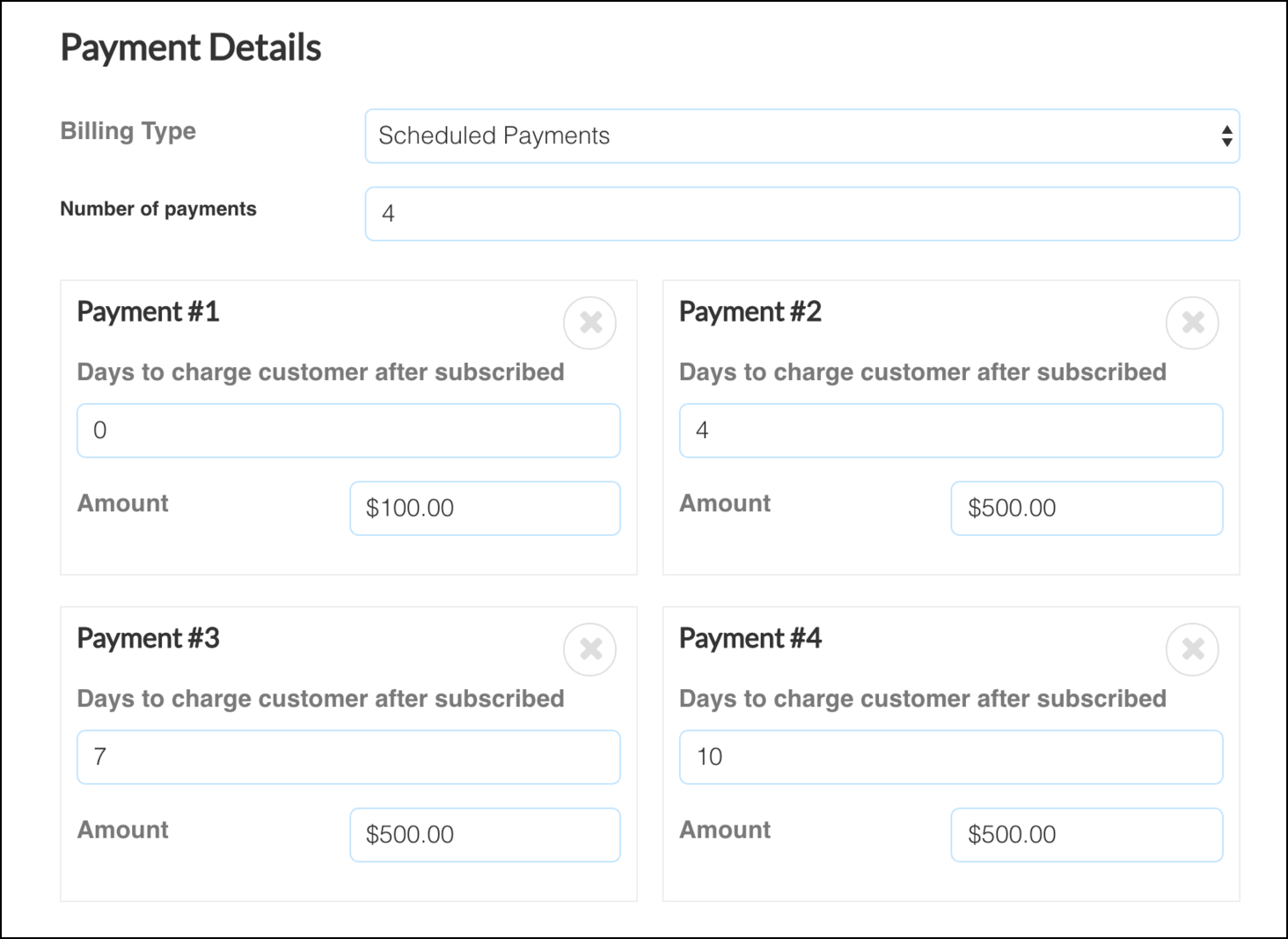With this latest release we added a new feature for allowing much more customizable payment plans. Here’s how it works — First, you set the billing type of a service to be “scheduled payments,” then you can set the number of payments desired, when each payment should occur, and the amount each payment should be.
