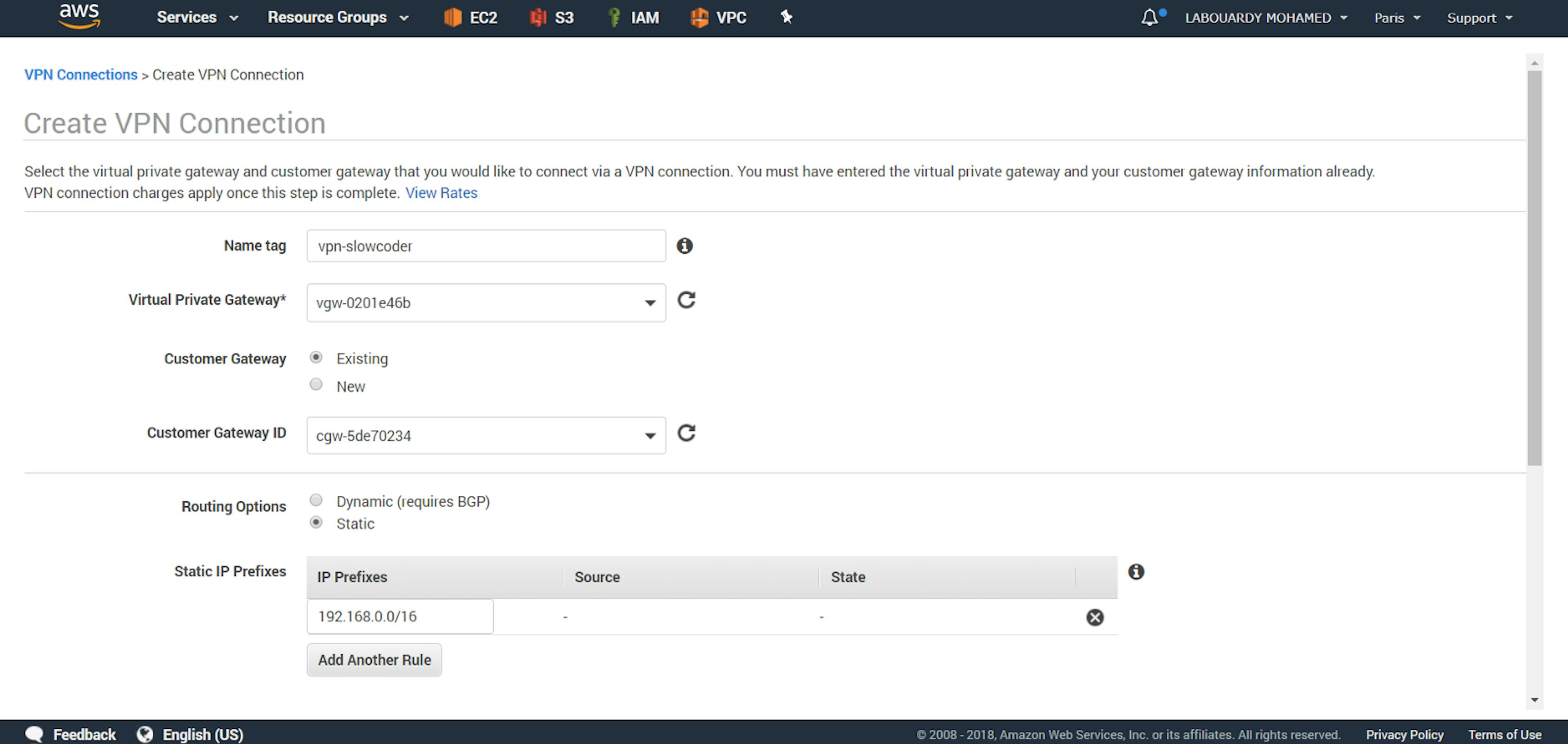 In my , I showed you how to use a like to create a secure tunnel to your private resources. In this post, I will walk you through step by step on how to setup a secure bridge to your remote from your home network with a as a . previous article VPN Software Solution OpenVPN AWS AWS VPC subnets Raspberry PI Customer Gateway To get started, find your public-facing IP address: Home Router Next, sign in to , navigate to and create a new : AWS Management Console VPC Dashboard VPN Customer Gateway Next, create a : Virtual Private Gateway And attach it to the target : VPC Then, create a with the and the : VPN Connection Customer Gateway Virtual Private Gateway Note: Make sure to add your to the section. Home CIDR subnet Static IP Prefixes Once the is created, click on “ ” tab, you should see two tunnels for redundancy: VPN Connection Tunnel Details It may take a few minutes to create the VPN connection. When it’s ready, select the connection and choose “ “, and open the configuration file and write down your and : Download Configuration Pre-shared-key Tunnel IP I used a (Quand Core CPU 1.2 GHz, 1 GB RAM) with , with enabled (default username & password: / ), you can login and start manipulating the PI: Raspberry PI 3 Raspbian SSH server pi raspberry kernel support must be installed. Therefore, you must install on your PI: IPsec openswan sudo apt-get install -y openswan lsof Update the file as below: /etc/ipsec.conf Create a new in : IPsec Connection /etc/ipsec.d/home-to-aws.conf : Your Raspberry PI private IP. left : Your Home Router public-facing IP. leftid : CIDR of your Home Subnet. leftsubnet : Virtual Private Gateway Tunnel IP. right : CIDR of your VPC. rightsubnet Add the tunnel to : pre-shared key /var/lib/openswan/ipsec.secrets.inc 89.95.X.Y 52.47.119.151 : PSK “irCAIDE1NFxyOiE4w49ijHfPMjTW9rL6” To enable the , edit , and ensure the following lines are uncommented: IPv4 forwarding /etc/sysctl.conf Run to reload it. Then, restart service: sysctl -p IPsec service ipsec restart Verify if the service is running correctly: If you go back to your you should see the 1st tunnel status changed to : AWS Dashboard, UP Add a new route entry that forwards traffic to your home subnet through the VPN Gateway: Note: Follow the same steps above to setup the 2nd tunnel for resiliency & high availablity of VPN connectivity. Launch an in the private subnet to verify the VPN connection: EC2 instance Allow SSH only from your : Home Gateway CIDR Once the instance is created, connect via using the server private ip address: SSH Congratulations ! you can now connect securely to your private EC2 instances. To take it further and connect from other machines in the same , add a static route as described below: Home Network 1 — Windows route add 10.0.0.0 MASK 255.255.0.0 192.168.1.81 2 — Linux sudo up route add -net 10.0.0.0 netmask 255.255.0.0 gw 192.168.31.232 3 — Mac OS X sudo route -n add 10.0.0.0/16 192.168.31.232 Test it out: