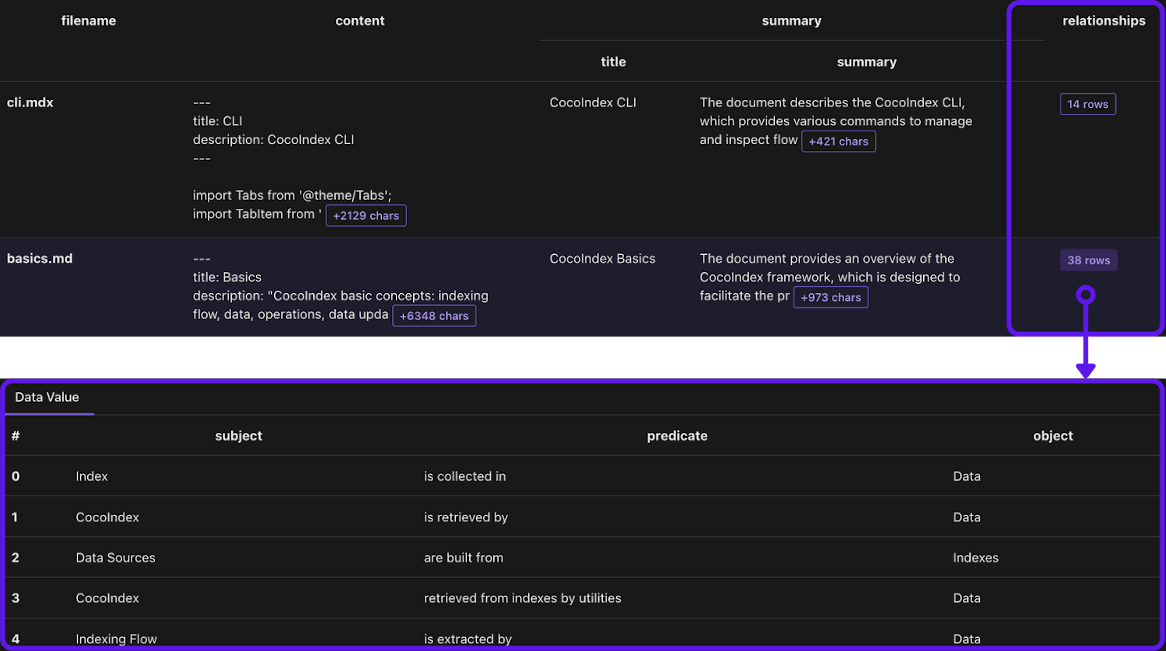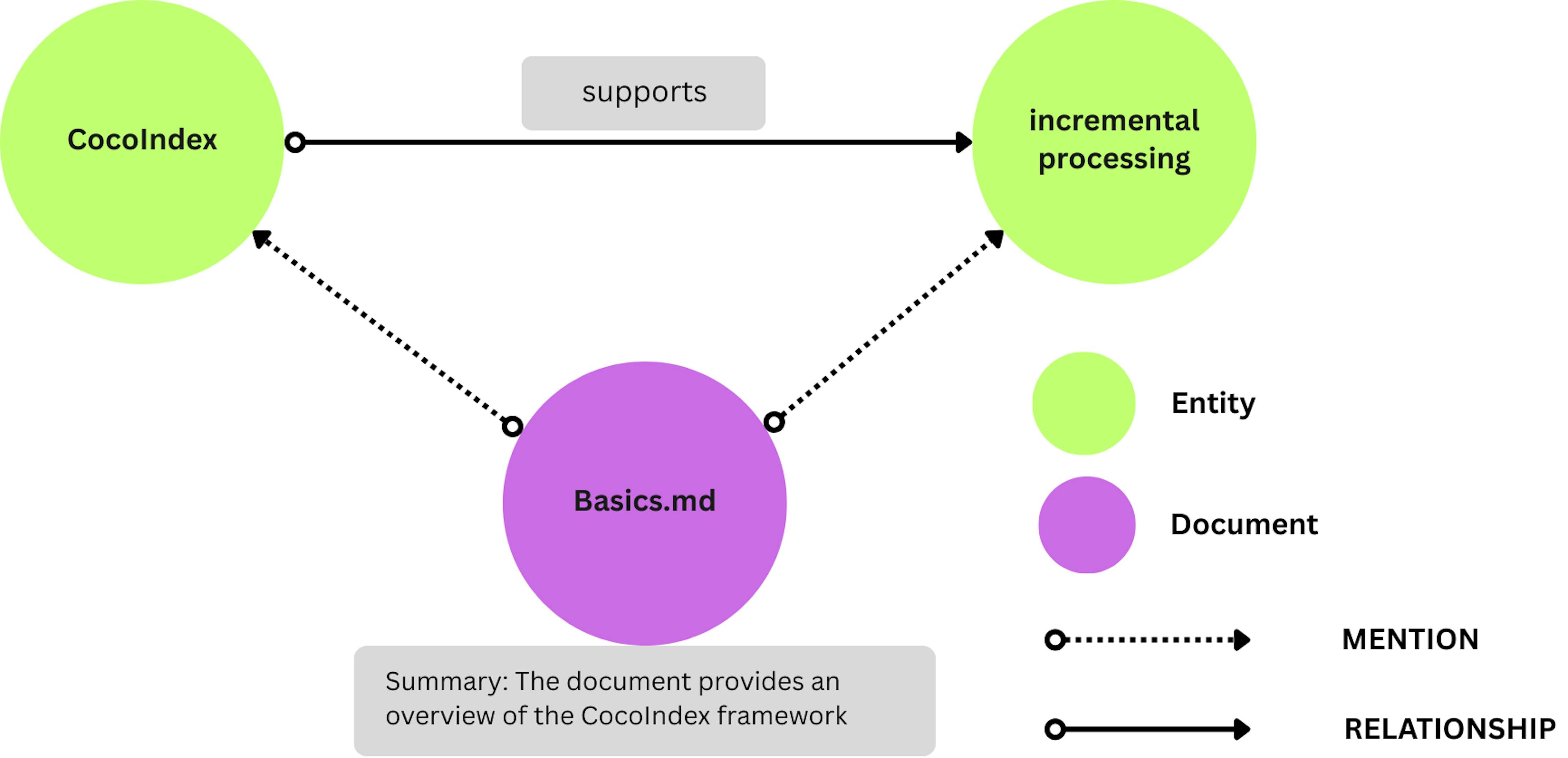 CocoIndex makes it easy to build and maintain knowledge graphs with continuous source updates. In this blog, we will process a list of documents (using CocoIndex documentation as an example). We will use LLM to extract relationships between the concepts in each document. We will generate two kinds of relationships: Relationships between subjects and objects. E.g., "CocoIndex supports Incremental Processing" Mentions of entities in a document. E.g., "core/basics.mdx" mentions CocoIndex and Incremental Processing. Relationships between subjects and objects. E.g., "CocoIndex supports Incremental Processing" Mentions of entities in a document. E.g., "core/basics.mdx" mentions CocoIndex and Incremental Processing. CocoIndex Incremental Processing We are constantly improving, and more features and examples are coming soon. Stay tuned and follow our progress by starring Stay tuned and follow our progress by starring ⭐ our GitHub repo. our GitHub repo. GitHub repo Prerequisites Install PostgreSQL. CocoIndex uses PostgreSQL internally for incremental processing. Install Neo4j, a graph database. Configure your OpenAI API key. Alternatively, you can switch to Ollama, which runs LLM models locally - guide. Install PostgreSQL. CocoIndex uses PostgreSQL internally for incremental processing. Install PostgreSQL Install Neo4j, a graph database. Install Neo4j Configure your OpenAI API key. Alternatively, you can switch to Ollama, which runs LLM models locally - guide. Configure your OpenAI API key guide Documentation You can read the official CocoIndex Documentation for Property Graph Targets here. here Data flow to build knowledge graph Add documents as source We will process CocoIndex documentation markdown files (.md, .mdx) from the docs/core directory (markdown files, deployed docs). .md .mdx docs/core markdown files deployed docs @cocoindex.flow_def(name="DocsToKG") def docs_to_kg_flow(flow_builder: cocoindex.FlowBuilder, data_scope: cocoindex.DataScope): data_scope["documents"] = flow_builder.add_source( cocoindex.sources.LocalFile(path="../../docs/docs/core", included_patterns=["*.md", "*.mdx"])) @cocoindex.flow_def(name="DocsToKG") def docs_to_kg_flow(flow_builder: cocoindex.FlowBuilder, data_scope: cocoindex.DataScope): data_scope["documents"] = flow_builder.add_source( cocoindex.sources.LocalFile(path="../../docs/docs/core", included_patterns=["*.md", "*.mdx"])) Here flow_builder.add_source creates a KTable. filename is the key of the KTable. flow_builder.add_source KTable filename Add data collectors Add collectors at the root scope: document_node = data_scope.add_collector() entity_relationship = data_scope.add_collector() entity_mention = data_scope.add_collector() document_node = data_scope.add_collector() entity_relationship = data_scope.add_collector() entity_mention = data_scope.add_collector() document_node collects documents. E.g., core/basics.mdx is a document. entity_relationship collects relationships. E.g., "CocoIndex supports Incremental Processing" indicates a relationship between CocoIndex and Incremental Processing. entity_mention collects mentions of entities in a document. E.g., core/basics.mdx mentions CocoIndex and Incremental Processing. document_node collects documents. E.g., core/basics.mdx is a document. document_node core/basics.mdx entity_relationship collects relationships. E.g., "CocoIndex supports Incremental Processing" indicates a relationship between CocoIndex and Incremental Processing. entity_relationship CocoIndex Incremental Processing entity_mention collects mentions of entities in a document. E.g., core/basics.mdx mentions CocoIndex and Incremental Processing. entity_mention core/basics.mdx CocoIndex Incremental Processing Process each document and extract summary Define a DocumentSummary data class to extract the summary of a document. DocumentSummary @dataclasses.dataclass class DocumentSummary: title: str summary: str @dataclasses.dataclass class DocumentSummary: title: str summary: str Within the flow, use cocoindex.functions.ExtractByLlm for structured output. cocoindex.functions.ExtractByLlm with data_scope["documents"].row() as doc: doc["summary"] = doc["content"].transform( cocoindex.functions.ExtractByLlm( llm_spec=cocoindex.LlmSpec( api_type=cocoindex.LlmApiType.OPENAI, model="gpt-4o"), output_type=DocumentSummary, instruction="Please summarize the content of the document.")) document_node.collect( filename=doc["filename"], title=doc["summary"]["title"], summary=doc["summary"]["summary"]) with data_scope["documents"].row() as doc: doc["summary"] = doc["content"].transform( cocoindex.functions.ExtractByLlm( llm_spec=cocoindex.LlmSpec( api_type=cocoindex.LlmApiType.OPENAI, model="gpt-4o"), output_type=DocumentSummary, instruction="Please summarize the content of the document.")) document_node.collect( filename=doc["filename"], title=doc["summary"]["title"], summary=doc["summary"]["summary"]) doc["summary"] adds a new column to the KTable data_scope["documents"]. doc["summary"] data_scope["documents"] Extract relationships from the document using LLM Define a data class to represent relationship for the LLM extraction. @dataclasses.dataclass class Relationship: """ Describe a relationship between two entities. Subject and object should be Core CocoIndex concepts only, should be nouns. For example, `CocoIndex`, `Incremental Processing`, `ETL`, `Data` etc. """ subject: str predicate: str object: str @dataclasses.dataclass class Relationship: """ Describe a relationship between two entities. Subject and object should be Core CocoIndex concepts only, should be nouns. For example, `CocoIndex`, `Incremental Processing`, `ETL`, `Data` etc. """ subject: str predicate: str object: str The Data class defines a knowledge graph relationship. We recommend putting detailed instructions in the class-level docstring to help the LLM extract relationships correctly. subject: Represents the entity the statement is about (e.g., 'CocoIndex'). predicate: Describes the 