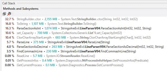 Reducing memory allocations from 7.5GB to 32KB Contents Context of the problem Establishing a baseline Easy win 1 Easy win 2 Splits are never cool Lists are not always nice Pooling byte arrays Goodbye StringBuilder Skipping commas The war between classes and structs Goodbye StreamReader TLDR — Give me a table Context of the problem is a financial services software company, part of what we do is to enable our customers to bulk import their data into our platform. For our services we require up-to-date information from all our clients, which includes lenders and manufacturers across the UK. Each of those imports can contain several hundred megabytes uncompressed data, which will often be imported on a daily basis. Codeweavers This data is then used to power our real-time calculations. Currently this import process has to take place outside of business hours because of the impact it has on memory usage. In this article we will explore potential optimisations to the import process specifically within the context of reducing memory during the import process. If you want to have a go yourself, you can use to generate a sample input file and you can find all of the code talked about . this code here Establishing a baseline The current implementation uses StreamReader and passes each line to the lineParser. <a href="https://medium.com/media/9e6d1b9676d1508fada0eed416cf5d04/href">https://medium.com/media/9e6d1b9676d1508fada0eed416cf5d04/href</a> The most naive implementation of a line parser that we originally had looked something like this:- <a href="https://medium.com/media/7efd374838b638e413fef1a61815da58/href">https://medium.com/media/7efd374838b638e413fef1a61815da58/href</a> The ValueHolder class is used later on in the import process to insert information into the database:- <a href="https://medium.com/media/afcb770d65486f2cdff212f82f202126/href">https://medium.com/media/afcb770d65486f2cdff212f82f202126/href</a> Running this example as a command line application and enabling monitoring:- <a href="https://medium.com/media/b18f5d9ef4c9b008ba847df8f1522b37/href">https://medium.com/media/b18f5d9ef4c9b008ba847df8f1522b37/href</a> Our main goal today is to reduce . In short, the less memory we allocate, the less work the garbage collector has to do. There are that garbage collector operates against, we will also be monitoring those. Garbage collection is a complex topic and outside of the scope of this article; but a good rule of thumb is that short-lived objects should never be promoted past generation 0. allocated memory three generations We can see V01 has the following statistics:- Took: 8,750 ms Allocated: 7,412,303 kb Peak Working Set: 16,720 kb Gen 0 collections: 1809 Gen 1 collections: 0 Gen 2 collections: 0 Almost 7.5 GB of memory allocations to parse a three hundred megabyte file is less than ideal. Now that we have established the baseline, let us find some easy wins… Easy win 1 Eagle-eyed readers will have spotted that we string.Split(',') twice; once in the line parser and again in the constructor of ValueHolder. This is wasteful, we can overload the constructor of ValueHolder to accept a string[] array and split the line once in the parser. After that simple change the statistics for V02 are now:- Took: 6,922 ms Allocated: 4,288,289 kb Peak Working Set: 16,716 kb Gen 0 collections: 1046 Gen 1 collections: 0 Gen 2 collections: 0 Great! We are down from 7.5GB to 4.2GB. But that is still a lot of memory allocations for processing a three hundred megabyte file. Easy win 2 Quick analysis of the input file reveals that there are 10,047,435 lines, we are only interested in lines that are prefixed with MNO of which there are 10,036,466 lines. That means we are unnecessarily processing an additional 10,969 lines. A quick change to V03 to only parse lines prefixed with MNO:- <a href="https://medium.com/media/a8b5adb1b6348a4a8e06f75819431027/href">https://medium.com/media/a8b5adb1b6348a4a8e06f75819431027/href</a> This means we defer splitting the entire line until we know it is a line we are interested in. Unfortunately this did not save us much memory. Mainly because we are interested in 99.89% of the lines in the file. The statistics for V03:- Took: 8,375 ms Allocated: 4,284,873 kb Peak Working Set: 16,744 kb Gen 0 collections: 1046 Gen 1 collections: 0 Gen 2 collections: 0 It is time to break out the trusty profiler, in this case :- dotTrace Strings in the .NET ecosystem are immutable. Meaning that anything we do to a string returns a brand new copy. Therefore calling string.Split(',') on every line (remember there are 10,036,466 lines we are interested in) returns that line split into several smaller strings. Each line at minimum has five sections we want to process. That means in the lifetime of the import process we create at least 50,182,330 strings..! Next we will explore what we can do to eliminate the use of string.Split(','). always Splits are never cool A typical line we are interested in looks something like this:- MNO,3,813496,36,30000,78.19,, Calling string.Split(',') on the above line will return a string[] containing:- 'MNO' '3' '813496' '36' '30000' '78.19' '' '' Now at this point we can make some guarantees about the file we are importing:- The length of each line is not fixed The number of sections that are delimited by a comma are fixed We only use the first three characters of each line to determine our interest in the line This means there are five sections we are interested in but the section length is unknown Sections do not change locations (e.g MNO is always the first section) Guarantees established, we can now build a short lived index of the positions of all the commas for a given line:- <a href="https://medium.com/media/0aecfff5995cd2eb17c6aa7c675096d7/href">https://medium.com/media/0aecfff5995cd2eb17c6aa7c675096d7/href</a> Once we know the position of each comma, we can directly access the section we care about and manually parse that section. <a href="https: