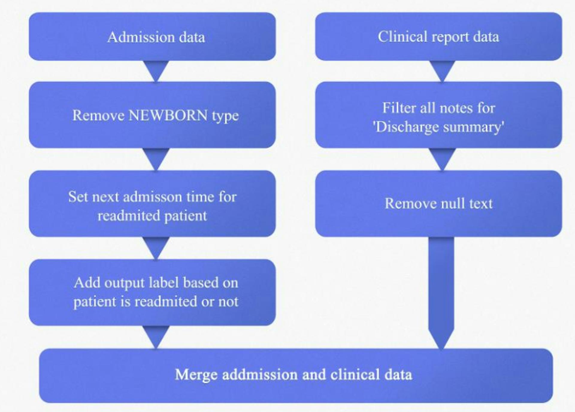 Authors: (1) Rasoul Samani, School of Electrical and Computer Engineering, Isfahan University of Technology and this author contributed equally to this work; (2) Mohammad Dehghani, School of Electrical and Computer Engineering, University of Tehran, Tehran, Iran and this author contributed equally to this work (dehghani.mohammad@ut.ac.ir); (3) Fahime Shahrokh, School of Electrical and Computer Engineering, Isfahan University of Technology. Authors: Authors: (1) Rasoul Samani, School of Electrical and Computer Engineering, Isfahan University of Technology and this author contributed equally to this work; (2) Mohammad Dehghani, School of Electrical and Computer Engineering, University of Tehran, Tehran, Iran and this author contributed equally to this work (dehghani.mohammad@ut.ac.ir); (3) Fahime Shahrokh, School of Electrical and Computer Engineering, Isfahan University of Technology. Table of Links Abstract and 1. Introduction Abstract and 1. Introduction 2. Related Works 2. Related Works 3. Methodology and 3.1 Data 3. Methodology and 3.1 Data 3.2 Data preprocessing 3.2 Data preprocessing 3.3. Predictive models 3.3. Predictive models 4. Evaluation 4.1. Evaluation metrics 4.1. Evaluation metrics 4.2. Results and discussion 4.2. Results and discussion 5. Conclusion and References 5. Conclusion and References 3. Methodology An overview of the proposed method can be observed in Figure 1. Following the preparation and preprocessing of the required data, including the conversion of textual data into numerical vectors, machine learning and deep learning models were designed and implemented to predict readmission. 3.1 Data For this research, the MIMIC-III dataset (Medical Information Mart for Intensive Care III) [29] was utilized. This freely available dataset encompasses data from over 50,000 patients (with their identifying information removed) admitted to a US hospital between 2001 and 2012. In this study, two key tables from this dataset were employed, namely the admission table and the clinical report table. The admission table contains information regarding patient admissions, while the clinical report table includes written records such as medical history and discharge instructions documented by attending physicians in the patient's file. 3.2 Data preprocessing Data preprocessing is a crucial step in training a model, as it directly impacts its performance. The quantity, quality, and diversity of data influence the effectiveness of machine and deep learning algorithms. To improve the reliability of the algorithms, it's vital to carefully select and preprocess the target data from the original dataset [30]. Efficient data preprocessing techniques such as dimensionality reduction and data transformation play a critical role in enhancing the extraction of valuable insights and knowledge from datasets [31]. We conducted two preprocessing phases on the input data. Initially, general preprocessing techniques were applied to the dataset records and columns, with the objective of improving data quality and structure. Following this, text preprocessing methods were utilized. 3.2.1. General preprocessing 3.2.1. General preprocessing As depicted in Figure 2, admission table and clinical report table were preprocessed separately to ensure that each dataset underwent tailored preprocessing steps suited to its specific characteristics and requirements. For admission table, following preprocessing steps were employed: • Data related to patients whose status was recorded as birth or death were removed. • Additional columns were added to the admission table to record the date and type of the patient's next admission to the hospital. These columns were populated for each patient's admission, with the information of their subsequent admission arranged in chronological order. For the last patient admission, the values of these columns were predicted using the research approach. Subsequently, only the rows of data were retained where the patient's admission was elective, excluding cases where the patient was admitted as an emergency. • A new column was added to store the number of days until the next admission, which serves as the target variable for this approach. The objective is to predict samples for which the value of this parameter will be less than 30 days, indicating readmission within a short time frame. The preprocessing steps applied to the clinical report table were as follows: • All notes for “Discharge summary” were filtered. • Null texts were removed. To further refine the dataset and reduce missing values in the considered columns, the admission tables and discharge summary reports were merged based on the patient's admission ID. 3.2.2. Text preprocessing 3.2.2. Text preprocessing Text preprocessing involves cleaning, transforming, and preparing textual data to make it suitable for analysis and modeling [32]. In Figure 3, the text preprocessing steps are illustrated. Stages of text preprocessing encompass a range of crucial tasks, including: • Tokenization: Tokenization is the process of breaking down text into individual components such as characters, words, phrases, or other elements known as tokens [33]. • Lemmatization: Groups inflected forms of words together based on their lemma. • Stop word removal: Stop words, such as “a”, “the”, “in”, “with”, which are often common terms in a language and lack meaningful information [34], are excluded. • Special words removal: Commonly occurring words and phrases, including titles, unidentified brackets, and drug dosages, are eliminated from all notes during preprocessing. In Figure 4 (a), the word cloud of the original data reveals a predominant focus on drug-related terms, dosage information, and titles, which are frequently repeated in the text but may not contribute significantly to predicting readmission. However, certain specific words, such as laboratory results, hold more relevance for conducting analysis.