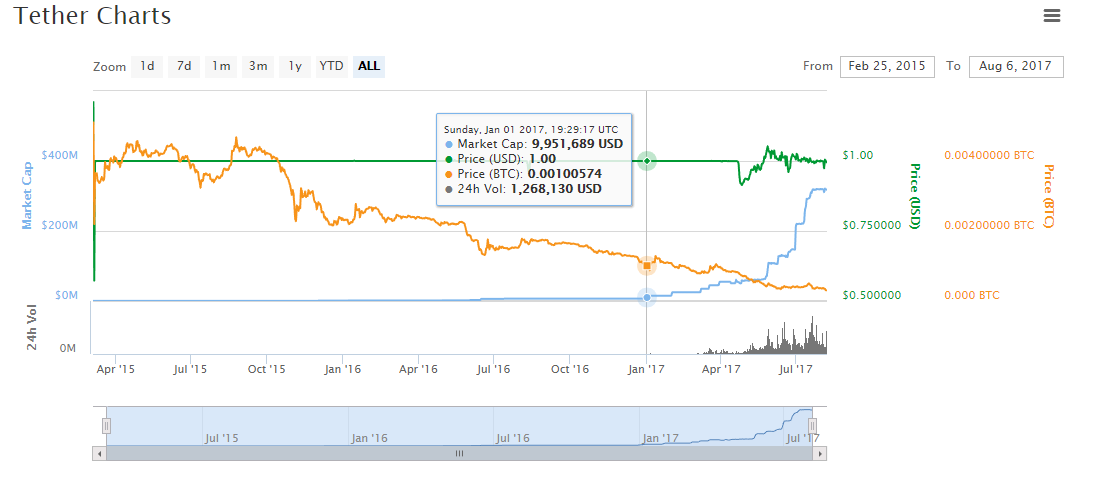 At the start of 2017, the amount of Tethers in circulation stood at around $10M ‘USD’, as can be seen on the CoinMarketCap history.