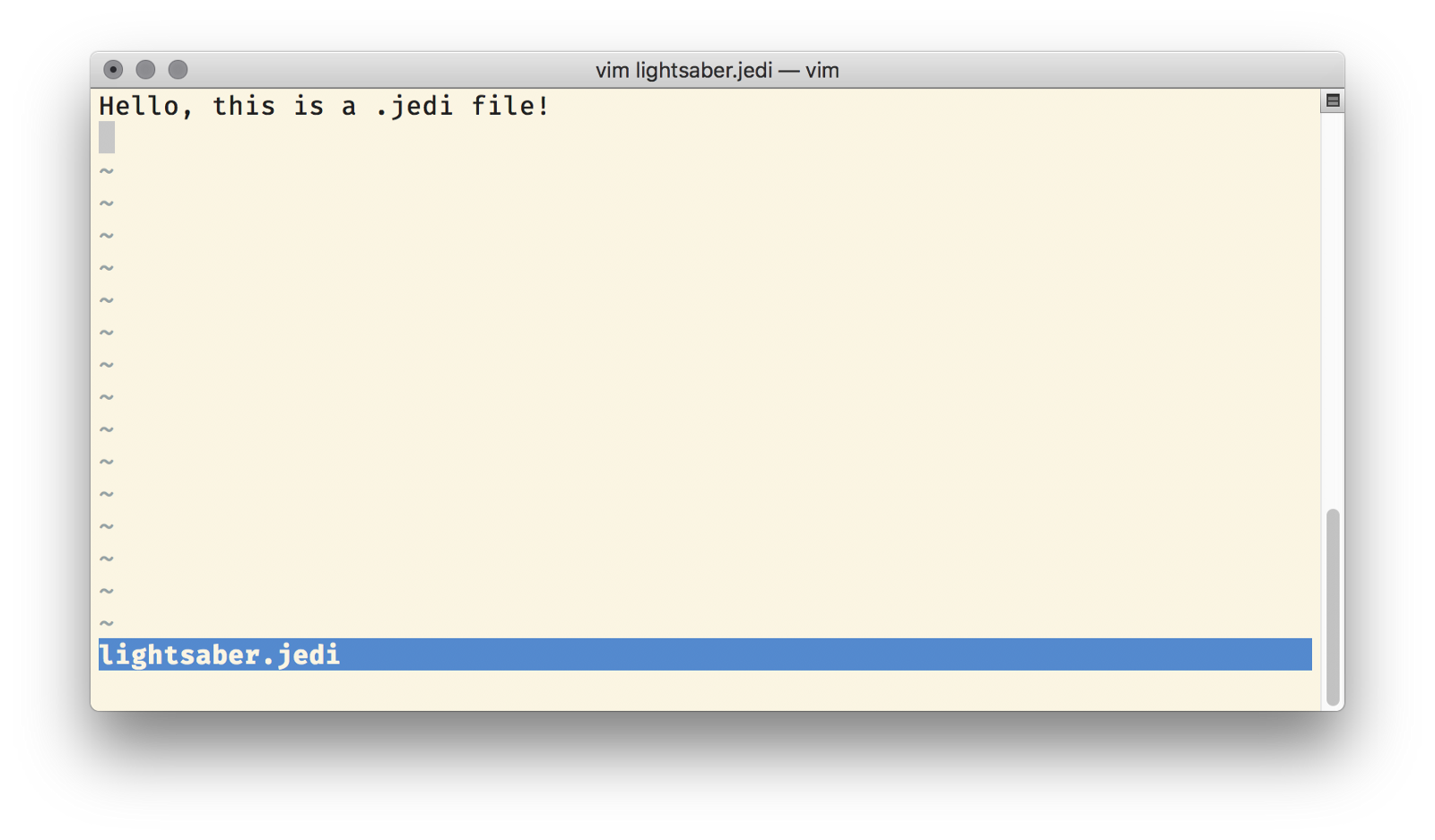 echo "Hello, this is a .jedi file" >> lightsaber.jediInsert the following into your Vim config.