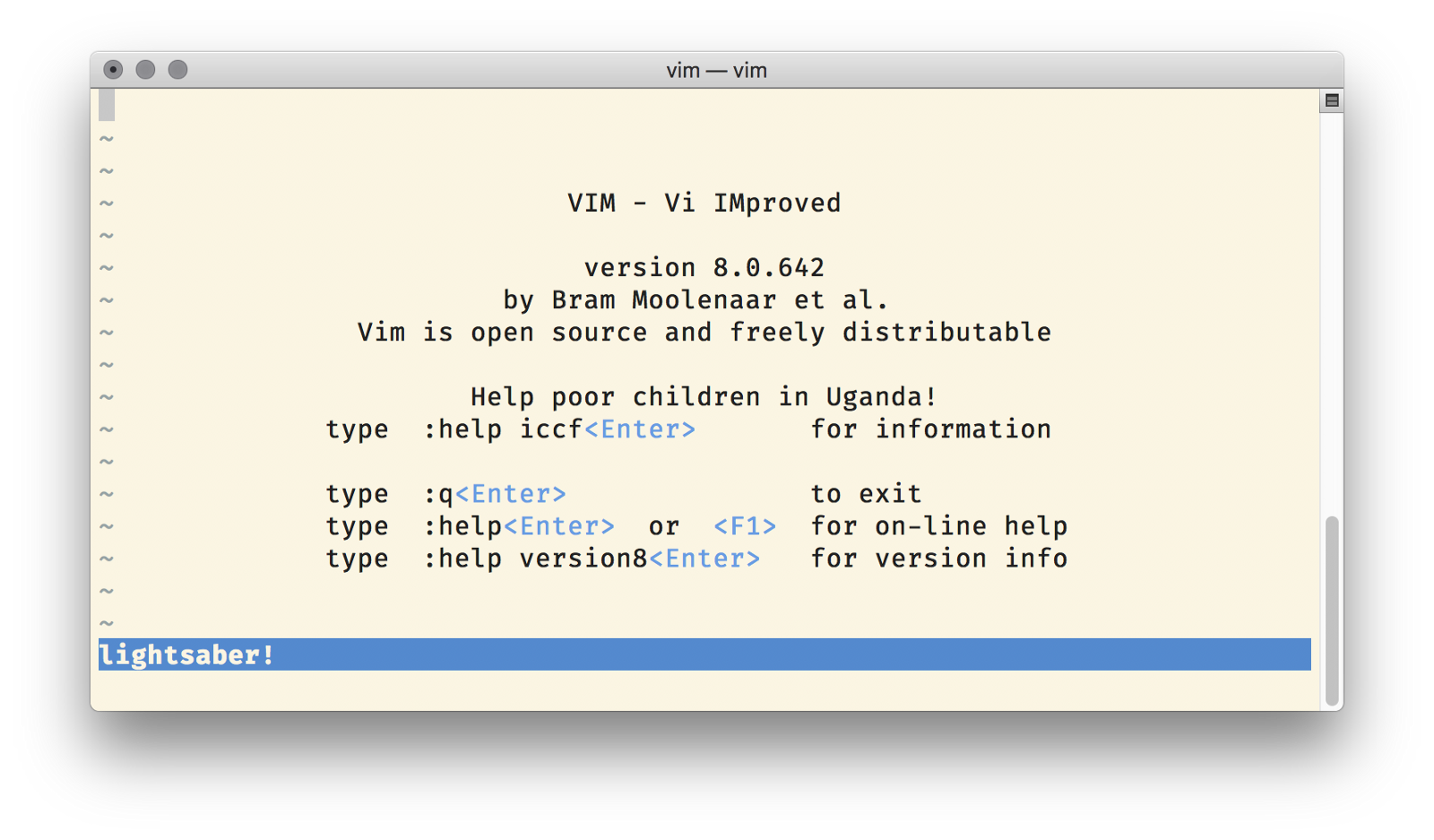 set statusline=lightsaber!When you reload Vim you should see: