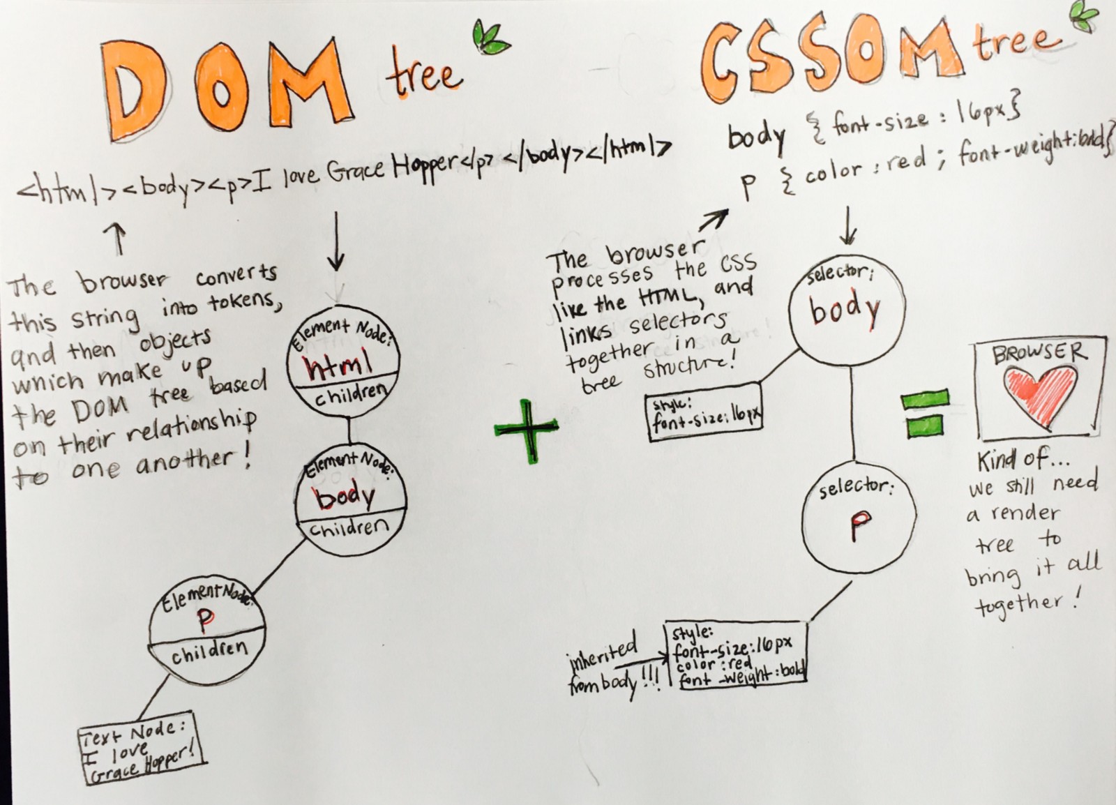 A data structure that appears in the everyday life of a web developer After graduating from the Grace Hopper Program last February, I accepted a Teaching Fellow position for the next cohort. My students often ask me how data structures relate to their lives as programmers, besides knowing how to ace white-boarding problems for job interviews. As someone who did not take CS course in college, I also struggled with data structures at first, but became fascinated once I realized that much of the underlying structure of software, including the browser, depends on them. The first practice we had with trees as students was creating a , along with insertion, traversal, and search methods. Binary Tree As we began to explore the browser, we learned how the browser’s render engine processes an HTML document and creates two trees: The (Document Object Model), a tree representing HTML element and attribute nodes, and a tree (CSS Object Model) of styles. DOM tree CSSOM CSS These two trees are then combined into a which contains the nodes and the styles needed to display DOM content on the page. render tree What is so fascinating about these trees is that, just like BSTs, they are often traversed For example, the CSSOM tree is recursively traversed. The browser processes the child nodes of the CSSOM tree first, because those specific style rules ultimately take precedence in the layout of the page. That means that as long as a node has children, a traversal function will continue to be called. Being able to show my students both use cases for trees AND recursion is really awesome! recursively. Finally, the tree and CSSOM tree are combined to form one last tree, the render tree! DOM Pretty cool, right? Here’s a super from Google’s Developer docs to learn more! helpful resource