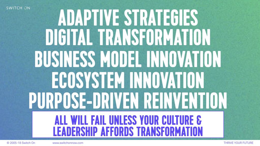 For years I ran a top-flight strategy and innovation consultancy. This was a rare phenomenon given that I was in my mid-20s. My business partner and I, with our fast-growing team, worked with C-Suite executives from over one hundred Fortune 500 and FTSE 100 companies to help them grapple with the digital and disrupted world and innovate the business models of the future. I was convinced that those who could wield the strategic innovation toolkit — a comprehensive suite of powerful tools for metabolizing changes in the environment into exponential billion dollar products, services, and business models — held the keys to the future of every organization and every industry. I was wrong. Or at least I was thoroughly misguided. Although running an innovation firm was great for my reputation, pocket, and sense of self-worth — and although we had some notable successes, liking supporting the innovation of the most successful TV show of all time — most of our work failed to deliver systemic impact. Why? Quite simple, because the organization’s didn’t have people in them who had the skills and qualities needed to lead and land the transformational changes in either products externally (product or service innovation) or internally (process or people innovation) that they briefed us to create. I still believe that strategic innovation, focused on genuinely transformational ideas, is most powerful approach for ensuring your organization survives the VUCA (Volatile, Uncertain, Complex, Ambiguous) reality we are in. It is the only way to avoid fighting with competition over marginal gains and, at worst, becoming obsolescent. Instead, you ensure you create new forms of value for both new and existing customers who have emerging, future-forward needs. But without something even more important, all the work done to generate exponential value out of constant change using strategic innovation will fail: all transformational leadership. In other words, it doesn’t matter how smart you executives are, how many MBAs are in the team, how many genii are put on the strategy project by management consultancies, or brilliance of the strategies and innovations you develop: if the people within an organization don’t have the level of consciousness needed to birth genuinely future-forward projects, products, and processes — then all will fail. What this means is that the greatest secret in 21st Century business is this: whoever holds the People Vision of an organization — whomever “owns” the vitality of the culture, is responsible for fostering psychological safety and empowerment, determines the style and skills of leadership needed and ensures the leadership development lands — holds the keys to the kingdom of 21st Century business success. This will become ever-more true because the speed of change outside an organization is getting faster so that every business unit, product, and category will need to continuously re-invent itself: i.e. not just one transformational innovation program to last 10 years but continuous transformation at all times. They don’t teach you this in Management School (at least not the ones I have guest lectured at). Few on the board are aware of this abiding truth (which is why there are very few, if any, CEOs who were once HR Directors). Most alpha-dog management consultants think the idea so anathema that they don’t even consider it let alone reject it. And many of those in HR don’t know this (or haven’t the power/empowerment needed to leverage this insight). I found this out when I did the headline keynote at the CHRO Summit on the West Coast and this insight went down like a lead balloon. As I have discovered, through the very personal experience of pivoting my entire business and career around this insight, it’s much less glamorous working in leadership development and culture-change than disruptive innovation and strategy consulting. Budgets are far, far smaller and much harder to get ahold of. C-Suite airtime is far less and senior leaders pay you less respect (until they go through a program that is). Managers expect culture to change easily (even though all evidence from their own lives and past experience would appear to contradict this assumption) so have little patience for how much time, energy, money and commitment it takes; which can be profoundly challenging when one wants to land a profound impact. In summary, most business leaders I meet recognize the need for a more agile, adaptable, innovative and collaborative culture and leadership capability; but few want to invest in it or deal with the messy, complex human beings that need to create it. It’s much easier to measure progress in productivity or in strategy development than it in culture-change and leadership development; so that’s where the big bucks go even as the business loses its competitive edge year after year. One of the key insights into performance I have had is that context is king. Context (people and leadership culture) is as, if not more, important than content (innovation, strategy, plans). The history of recent spectacular leadership failures — from Kodak to Mubarak — shows us that what make smart executives fail is their assumptions and habits as leaders: that is to say, their consciousness. An organization cannot outperform the consciousness of its leaders, something we finally have tangible evidence for. In the most , 38% of business outcomes are dependent on the mastery and creativity of leaders; and that the top 20% of leaders deliver fully 600% better measurable results compared to their mainstream “average” counterparts. This means that currently at least 80% of leaders are out-matched by the “VUCA” world and will lead organizations to fade, and possibly fail. This is why Yale Management Schools has estimated that 75% of all Fortune 500 businesses will disappear by 2027. advanced research into the impact of effective leadership on results coverin