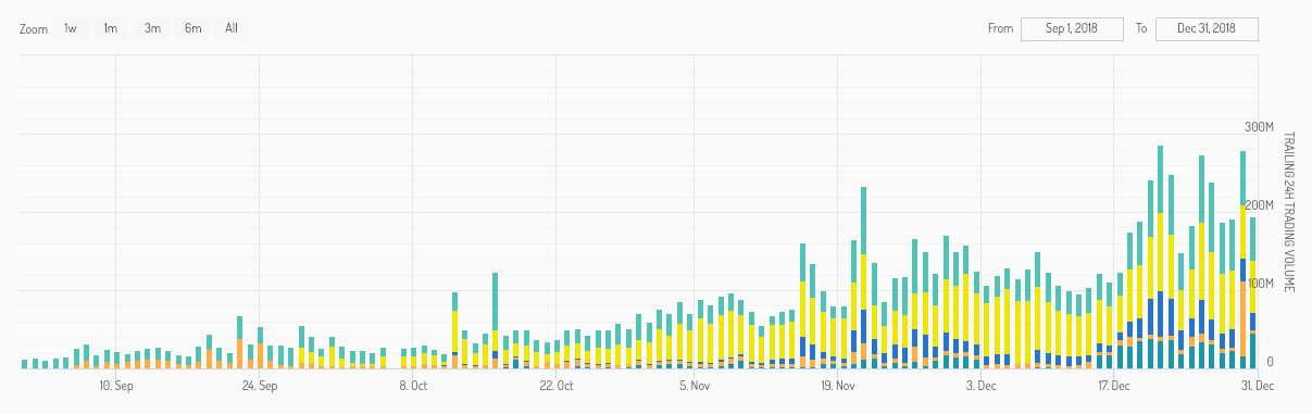 by Josh Stark , Evan Van Ness , and Daniel Zakrisson Can we build a universal platform for digital money and assets, un-censorable applications, and decentralized organizations? Ethereum began as a bold experiment. Over time, the Ethereum community began new experiments. Would developers find it interesting? What applications are actually useful? The community learned from its successes and failures, and iterated on their work. New people joined the community and started running their experiments. We started with a slightly smaller experiment: was it possible to launch a blockchain that could execute arbitrary programs? own What did we learn? This summary of the year in Ethereum is our attempt to identify the most important developments — the things that we’ll say mattered, 10 years out. In 2018, the Ethereum community ran more experiments than ever before. These developments took place at every level of the Ethereum “stack”. This includes the core protocol and the clients that implement it, commonly referred to as “ ”. It includes the supporting , that make engineering on Ethereum possible. It includes “ ” technologies, that let developers build fast and performant applications. And it includes the products and businesses Layer 1 developer tools & infrastructure off chain built on Ethereum . There are competing implementations of many infrastructure technologies — including two clients with ~50% ( ) and ~40% ( ) of the network. There are multiple competing off-chain technology stacks being built, multiple ETH 2.0 clients under development, and most markets have multiple competing businesses. It feels messy and chaotic — . While this can make it hard to follow, it’s a credit to the community: we’re too big to measure with . Keeping track of everything in this ecosystem is becoming more and more difficult every week. Geth Parity the Ethereum ecosystem is a bazaar, not a cathedral simple tools . In our view, here are the most important developments in 2018: Our goal is to help you sort through that noise and see the bigger picture but we’re still far from mass adoption. 1. More people started using Ethereum, for more things — a new class of applications that saw many product launches and some breakout successes. 2. Decentralized Finance (DeFi) and stablecoins — — it became radically easier to build applications on Ethereum. Our development and security tooling improved significantly, we got better at sharing best practices, and hackathons became a trend. 3. The year of #BUIDL — multiple “layer 2” applications launched, and we made critical progress towards making these scaling solutions easy to use for developers. 4. Layer 2 scaling — this year it felt like every technical conversation in Ethereum was “We can do it this way right now, but of course once we have good zkSTARKs…” 5. Zero knowledge technology — the roadmap solidified, and it moved from a research project to an engineering effort. 6. ETH 2.0 / Serenity 1. Did adoption of Ethereum grow in 2018? Today, that answer feels settled: since late 2017, the Ethereum has continued to be used near maximum capacity: From 2015–2017, it was an open question whether there would ever be_any_ demand for Ethereum. blockchain Source: Google Bigquery Ethereum public dataset Specifically, . When the line approaches 1, it means the Ethereum blockchain is being used at nearly 100% capacity. This graph shows the utilization of the Ethereum blockchain at different points in time. it is a measure of the total gas used divided by the gas limit But it means we started asking harder questions: we’re near 100% capacity even with such a small user base? What would happen to fees if we on-boarded of users, when the total capacity of the network is so low? How many actually use Ethereum? What are they using it for? And what are the right metrics to measure growth? Yes, the graph above is encouraging — people are paying to use the Ethereum blockchain. millions people Measuring “use” of Ethereum isn’t easy. For instance, we can get a basic picture using raw on-chain statistics, like the : number of transactions on the network Source: https://etherscan.io/chart/tx But this doesn’t tell the whole story. If Ethereum was being used near full capacity, how can the number of transactions be declining? For instance, token transfers (~50K gas) or opening up a MakerDAO CDP (up to 900K gas) both “take up” more of the network’s capacity than a simple ETH transfer (21K gas). The composition of transactions on Ethereum shifted from a large number of simple ones, to a smaller number of complex ones. As Ethereum’s app layer continues to grow, we should expect the transaction count to decline while the chain operates at full capacity. And as more activity moves into side chains, state channels, or plasma chains (see ), measuring on-chain on-chain transactions increasingly only tell part of the story. Layer 2 What are people using the network for? Many significant and long-awaited applications went live in 2018, and appear to be attracting users. , the stablecoin launched by , has been live since late 2017, and the total supply of Dai grew to 69m as of December 31st, 2018. Dai MakerDAO Source: mkr.tools As of December 31st, the value of that ether was over $275 million. We discuss MakerDAO, and other “decentralized finance” applications, in detail in the . Users of MakerDAO have locked more than 1.7% of all ether into smart-contracts that serve as collateral for the Dai stablecoin. next section , a decentralized prediction market under development since 2015, launched in July 2018 and has seen open interest (the amount of value currently “bet” on the system) grow to a high over over $2.96m in November 2018. However, the total number of users has remained low. Augur , a payment channels service for the adult entertainment industry, launched in April 2018 and to performers between April and December 2018.