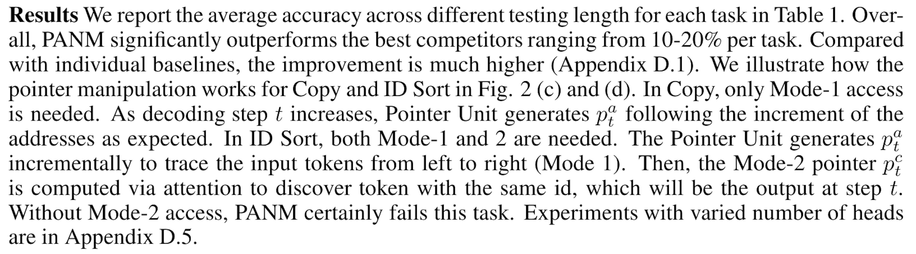 Authors: (1) Hung Le, Applied AI Institute, Deakin University, Geelong, Australia; (2) Dung Nguyen, Applied AI Institute, Deakin University, Geelong, Australia; (3) Kien Do, Applied AI Institute, Deakin University, Geelong, Australia; (4) Svetha Venkatesh, Applied AI Institute, Deakin University, Geelong, Australia; (5) Truyen Tran, Applied AI Institute, Deakin University, Geelong, Australia. Table of Links Abstract & Introduction Methods Methods Part 2 Experimental Results Experimental Results Part 2 Related Works, Discussion, & References Appendix A, B, & C Appendix D 3. Experimental Results In §3.1-3.3, our chosen tasks are representative of various types of symbolic reasoning and wellknown benchmarks to measure the symbol-processing capability of ML models. To showcase that these tasks are non-trivial, we report how Chat-GPT failed on our tasks in Appendix D.6. We validate the contribution of our methods in other practical tasks in §3.4. We also explain the choice of competing baselines in Appendix D. 3.1 Algorithmic Reasoning In our first experiment, we study the class of symbol processing problems where an output sequence is generated by a predefined algorithm applied to any input sequence (e.g., copy and sort). The tokens in the sequences are symbols from 0 to 9. The input tokens can be coupled with meta information related to the task such as the priority score in Priority Sort task. During training, the input sequences have length up to L tokens and can grow to L + 1, 2(L + 1), 4(L + 1) or 8(L + 1) during testing. Our setting is more challenging than previous generalization tests on algorithmic reasoning because of four reasons: (1) the task is 10-class classification, harder than binary prediction in Graves et al. [2014], Le and Venkatesh [2022], (2) the testing data can be eight time longer than the training and the training length is limited to L ≈ 10, which is harder than Grefenstette et al. [2015], (3) there is no curriculum learning as in Kurach et al. [2015], and (4) the training label is the one-hot value of the token, which can be confusing in case one token appears multiple times in the input sequence and tougher than using label as the index/location of the token as in Vinyals et al. [2015]. Baselines are categorized into 4 groups: (1) Traditional RNNs such as LSTM [Hochreiter and Schmidhuber, 1997], (2) Sequential attention models: Content Attention [Bahdanau et al., 2014], Location Attention [Luong et al., 2015], Hybrid Attention (our baseline concatenates the attention vectors from content and location attention), (3) MANNs such as NTM [Graves et al., 2014], DNC [Graves et al., 2016], Neural Stack [Grefenstette et al., 2015] and Transformer [Vaswani et al., 2017], and (4) pointer-aware models: NRAM [Kurach et al., 2015], PtrNet [Vinyals et al., 2015], ESBN [Webb et al., 2020] and our method PANM. In this synthetic experiment, we adopt LSTM as the encoder for PANM. All baselines are trained with fixed number of steps (100K for ID Sort and 50K for the rest), which is enough for the training loss to converge. For each task, each baseline is trained 5 times with different random seeds and we use the best checkpoint on L + 1 mode validation to evaluate the baselines. This paper is available on arxiv under CC BY 4.0 DEED license. Authors: (1) Hung Le, Applied AI Institute, Deakin University, Geelong, Australia; (2) Dung Nguyen, Applied AI Institute, Deakin University, Geelong, Australia; (3) Kien Do, Applied AI Institute, Deakin University, Geelong, Australia; (4) Svetha Venkatesh, Applied AI Institute, Deakin University, Geelong, Australia; (5) Truyen Tran, Applied AI Institute, Deakin University, Geelong, Australia. Authors: Authors: (1) Hung Le, Applied AI Institute, Deakin University, Geelong, Australia; (2) Dung Nguyen, Applied AI Institute, Deakin University, Geelong, Australia; (3) Kien Do, Applied AI Institute, Deakin University, Geelong, Australia; (4) Svetha Venkatesh, Applied AI Institute, Deakin University, Geelong, Australia; (5) Truyen Tran, Applied AI Institute, Deakin University, Geelong, Australia. Table of Links Abstract & Introduction Abstract & Introduction Methods Methods Methods Part 2 Methods Part 2 Experimental Results Experimental Results Experimental Results Part 2 Experimental Results Part 2 Related Works, Discussion, & References Related Works, Discussion, & References Appendix A, B, & C Appendix A, B, & C Appendix D Appendix D 3. Experimental Results In §3.1-3.3, our chosen tasks are representative of various types of symbolic reasoning and wellknown benchmarks to measure the symbol-processing capability of ML models. To showcase that these tasks are non-trivial, we report how Chat-GPT failed on our tasks in Appendix D.6. We validate the contribution of our methods in other practical tasks in §3.4. We also explain the choice of competing baselines in Appendix D. 3.1 Algorithmic Reasoning In our first experiment, we study the class of symbol processing problems where an output sequence is generated by a predefined algorithm applied to any input sequence (e.g., copy and sort). The tokens in the sequences are symbols from 0 to 9. The input tokens can be coupled with meta information related to the task such as the priority score in Priority Sort task. During training, the input sequences have length up to L tokens and can grow to L + 1, 2(L + 1), 4(L + 1) or 8(L + 1) during testing. Our setting is more challenging than previous generalization tests on algorithmic reasoning because of four reasons: (1) the task is 10-class classification, harder than binary prediction in Graves et al. [2014], Le and Venkatesh [2022], (2) the testing data can be eight time longer than the training and the training length is limited to L ≈ 10, which is harder than Grefenstette et al. [2015], (3) there is no curriculum learning as in Kurach et al. [2015], and (4) the training label is the one-hot value of the token, which can be confusing in case one token a