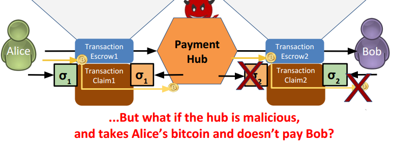 I will show you how the Tumbler forwards your bitcoins without the ability of exit scamming on you. “Meh, this is already boring, I stop reading there.” — Do not make that immature decision just yet. What if I tell you, by the end of this article you will have all the knowledge to build a trustless ShapeShift? In , I described why TumbleBit is important, in I described how far this idea can take us and in I finally described how the first key attribute of TumbleBit can be achieved: . In this article I define the missing piece, the second key attribute of it: . What I express here is not only the basic concept what TumbleBit is built on but the basic concept of payment channels, payment hubs and lightning network. If you are interested in any of those, stick around! Part 1: Making The Case Part 2: The Endgame Part 3: Not Even The Tumbler Can Breach Your Privacy anonymity trustlessness State of Development I cannot avoid first addressing the question you guys are most interested about. When can I use it?While the is pretty much ready and you can use it in an extremely impractical way through a CLI interface and Bitcoin Core, TumbleBit needs liquidity and this will not achieve it.On the other hand integrating TumbleBit into an existing Bitcoin wallet is a no-go as well. The problem is that The solution is to build a Bitcoin wallet that does not ruin full node level privacy and not as cumbersome as a full node. This is where and comes in. We are both working on a dedicated TumbleBit wallet independently.Without going into much details I just drop a part of the road map of my HiddenWallet here: TumbleBit core protocol if the wallets that your peers are using in the mix are screwed up from a privacy point of view, even if you are using TumbleBit in the correct way, with a fullnode, your anonymity is screwed up because of your peers. HiddenWallet BreezeWallet — Full Block Downloading SPV Ready, unstable — TumbleBit integration, Classic Tumbler Mode I am currently working on it. — 10–100x performance increase. Transaction Filtered Block Downloading Release stable version. The Cool Crypto Stuff Note: I only describe here the basic idea of how trustless coin exchange works and of course not the full TumbleBit protocol. More specifically I am describing how a unidirectional payment hub works. The above illustration shows how a unidirection payment hub works. If you already understand it then sorry, I just wasted two minutes of your life by making you read the introduction and asking you to stop reading here. If not, stick around and you will see the magic. First imagine wants to send 1 BTC. How does she do that? Well she sends 1 BTC to Bob. I hope you can follow. Alice Bob Next introduce the . Hub Now Alice wants to send 1 BTC to Bob through the Hub. I know that is pretty pointless, however it will make sense. How does she do that? First Alice sends 1 BTC to the Hub, then the Hub sends 1 BTC to Bob. So far so good, we just introduced a second pointless transaction, so we can pay twice as much network fee and we can wait twice as much time as we would usually do. However, it gets even worse. What if the Hub decides to steal Alice’s money and it does not forward the coins to Bob. Let us try to solve that issue, shall we? Let us say Alice and the Tumbler are sending some special transactions instead of regular transactions, which will not solve the issue for now, although it will bring us closer to the solution. As you can see the transactions we introduced are . escrow transactions What does this really mean? Let us examine Alice’s transaction to the Hub. The transaction says: “Hey, I am a transaction and I can talk. I am coming from Alice’s wallet and going to Hub’s wallet, however, I am not quite there yet, just somewhere in between. The thing is, Hub cannot spend me alone. It can only spend me with Alice together. If the transaction that is attempting to spend me is not signed by both Alice and the Hub that transaction will be rejected by the Bitcoin network. However, there is more. If I will not be spent within one month I will let Alice spend me without Hub’s signature.“ Similarly the transaction from the Hub to Bob: I decided not to write it down what this transaction exactly said, because it was apparently Chinese, and I am too lazy to translate it. You must figure out from the box above. What do we have now? We just made four transactions in order to transfer 1 BTC from Alice to Bob through the Hub. That is four times a normal transaction fee. In fact, it is even more, because the escrow transactions are bigger than the normal transactions, not in money but in actual size, in bytes, which is what actually matters when you pay the transaction fee in Bitcoin. What did we solve? Nothing, the Hub can still steal our coins. Wait, why four transactions? Think about it, the escrow transaction is not a transaction from Alice to Hub. It is a special transaction somewhere in the middle. Therefore there must be another transaction that spends that transaction to the Hub’s wallet. We will call this a . claim transaction Do you remember what the Escrow1 transaction said? Did it not feel a little strange? It did not talk much about itself, rather it was talking about the transaction that wants to spend it, the claim transaction.Now, I have a question. Do you know how do we call it when Alice signs the Claim1 transaction, however the Hub not yet? It is called . Then the Hub can steal your coins, can it not? Yes, it can, however, that is the last problem we will solve. For now, let us : opening a payment channel close the payment channel Exactly the same things happen in the payment channel between Hub and Bob. Pretty neat, huh? You just mastered a super complicated illustration.Now let us get back to the problem we just discovered. The Hub will be able to steal Alice’s money if Alice signs the Claim1 transaction before the Hub signs Claim2 transaction to Bob. If Hub signs Cla