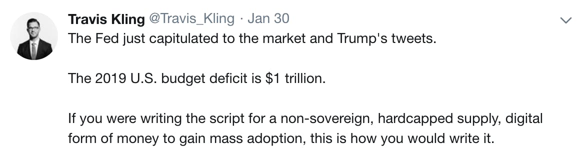 What happened this week in the Crypto markets? The Fed blinks After posting their worst December in 87 years, stocks bounced back in spectacular fashion in January as the S&P 500 Index rose 2.0% last week to finish January 8% above its year-end closing level. The stock market has now gained 16% since the December 24 lows, after to force reassure them. We’ve highlighted the lack of correlation between the stock market and the crypto markets many times in the past, so the equity returns themselves don’t matter much to crypto as an asset class. What does matter is this rally occured. The Fed has done a complete “about face” on its policy, ignoring strong employment data and inflation figures which normally drive motivation, and instead have focused purely on stock market returns and sentiment. As our friends at Ikigai stated last week, “the now dovish Fed is great for risk-on assets and validates the idea that Central Banks are irresponsible, thus reinforcing Bitcoin’s original value proposition.” Once again, we remind all investors, even those who think digital assets are irrelevant, to remember . You can only push something so far until it finally breaks. Mnuchin called the banks why why Bitcoin and other cryptocurrencies exist in the first place So Equity Markets are Fragile, What About Crypto? Meanwhile, crypto markets were largely unchanged last week, but January still concluded with a sixth straight negative monthly performance, the longest stretch ever. Bitcoin’s Largest Drawdowns Source: Ark Invest While February is historically a very good month for crypto prices, there doesn’t seem to be enough tangible data to sink your teeth into in order to make this market move materially higher or lower. all of the positive announcements that are on the horizon in crypto, but the fact is, none of these events are actually happening today. All of the positives are important, but remain highly speculative and forward looking. Until we witness some actual substance to support all of the great announcements and infrastructure investments, it’s unlikely that this market can go materially higher. Even when certain protocols and projects deliver positive results or outcomes, the boost to token prices is often short-lived as the increased valuations can’t be sustained. As long-time investor, Tim McDonald, : Last week we even highlighted technology wisely stated this week The crypto narrative is still strong, but adoption remains weak. Bubbles vs Adoption So that leaves us at an impasse. We have a technology that is undoubtedly promising, coupled with major investments across the whole ecosystem reinforcing the future role that Digital Ledger Technology (DLT) will have on financial services and beyond. Yet prices of today’s digital assets don’t necessarily reflect this future. It’s become clear that investors are now demanding that these investments in the infrastructure begin to bear fruit before the asset class can grow any further. And that takes time. Daniel Heyman, a developer working on Ethereum projects at Consensys, (paraphrasing): put it best In many ways, the bubbles created by the frenzy in the installation phase makes it possible for the new technology to succeed. The bubble creates a burst of (over-) investment in the infrastructure of the new technology (railways, canals, fiber optic cables, etc.). This infrastructure makes it possible for the technology to successfully deploy after the bubble bursts. The bubbles also encourage a spate of experimentation with new business models and new approaches to the technologies, enabling future entrepreneurs to follow proven paths and avoid common pitfalls. While the bubble creates a lot of financial losses and economic pain, it can be crucial in the adoption of new technologies. The bubble [in crypto] came early because blockchain technology enabled liquidity earlier in its life cycle. More bubbles are likely. Although there are no “good bubbles,” bubbles can have good side effects. During Canal Mania and Railway Mania, canals and railways were built that had little hope of ever being profitable. Investors lost money, but after the bubble, these canals and railways were still there. This new infrastructure made future endeavors cheaper and easier. After the internet bubble burst in 2001, fiber optic cables were selling for pennies on the dollar. Investors did terribly, but the fiber optics infrastructure created value for consumers and made it possible for the next generation of companies to be built. This over-investment in infrastructure is often necessary for the successful deployment of new technologies. This analysis suggests that the best case scenario for crypto in the near-term may be more speculative bubbles, which will ultimately crash as all previous bubbles have. During this time, many investments will ultimately be wiped out, but each building block created will ultimately accrue value to those companies/projects/protocols/users that remain relevant during the subsequent phase(s). Different investing strategies will take advantage of this in different ways… quant funds will take advantage of the elevated volatility, VC funds will patiently wait for the cycle to conclude, and liquid strategies will adapt to what is most profitable. This is a key rationale for why active management matters in crypto, today and in the future, as fund managers offer the ability to navigate these bubbles and crashes to discover where value will ultimately accrue. Notable Movers and Shakers A choppy week left most tokens largely unchanged week-over-week. Those that outperformed generally were caused by news of increased future adoption via enhancements that are still months if not years away. NEM (XEM) token saw a 26% selloff last week following . According to the foundation, the organization is nearing bankruptcy and making a last ditch effort to sell some of their tokens to stay afloat. layoffs from the NEM Foundation Aug