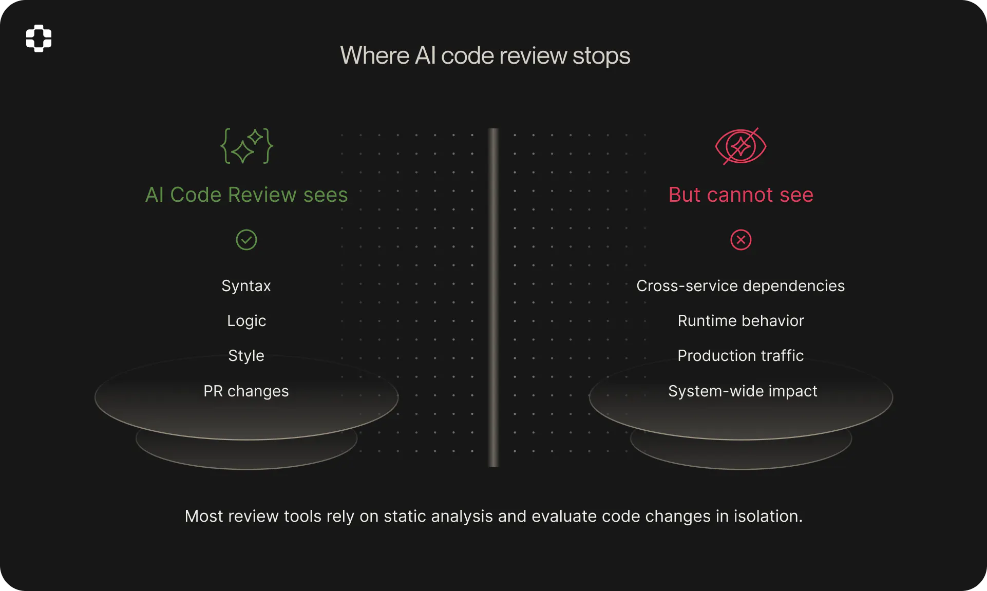 The AI code review market is exploding. OpenAI, Anthropic, Cursor, and Cognition have all launched code review features. Dedicated AI code review tools like Greptile, CodeRabbit, Macroscope, and dozens of YC startups are competing for market share. Everyone is building automated code review powered by LLMs. There is a lot of discussion in the industry right now about where this space is headed. Many predict a future where AI agents write code and AI agents review code, with minimal human involvement. That vision is probably correct. But the entire conversation misses something important. The problem is not that we have too many AI code review tools. The problem is that teams are asking AI code review to do a job it was never designed for. Code review and QA testing are different disciplines that solve different problems. Conflating them is why teams are disappointed when their AI code reviewer approves code that breaks in production. disappointed when their AI code reviewer disappointed when their AI code reviewer The Fundamental Difference Between Code Review and QA Testing Code review and QA testing are different disciplines that solve different problems. Conflating them is why teams are disappointed when their AI code review tool approves code that breaks in production. Understanding this distinction is critical for choosing the right AI tools for your engineering workflow. What AI Code Review Tools Actually Do Automated code review exists to ensure code quality and architectural consistency. When a senior engineer reviews your pull request, they are checking: Does this follow our patterns? Is the logic sound? Are there obvious bugs? Does it maintain our architectural standards? That takes five to ten minutes because the reviewer is not trying to verify the software actually works for customers. They are checking if the code meets internal standards. This is valuable work that should be automated. Modern AI code reviewers use large language models to understand codebases, enforce style guides, catch common bugs, and maintain consistency across contributors. They are excellent at automating what human reviewers spend most of their time on during pull request review. But AI code review has never been responsible for answering: Does this work for actual customer scenarios? That is what QA testing does. What QA Testing Actually Does (And Why It's Different From Code Review) Quality assurance teams run specific use cases to verify customer reality. They test edge cases. They check integration points. They validate that the checkout flow works with promo codes, that the API handles rate limiting correctly, that the background job processes data without memory leaks. Software testing is not a five minute activity. This is dedicated QA engineers spending hours or days testing real scenarios because you cannot ship software to customers based solely on whether it passes architectural review. Traditional QA testing includes: Functional testing: Does each feature work as specified? Integration testing: Do services communicate correctly? Regression testing: Did this change break existing functionality? Performance testing: Does this handle production load? Edge case testing: What happens with unusual inputs or configurations? Functional testing: Does each feature work as specified? Integration testing: Do services communicate correctly? Regression testing: Did this change break existing functionality? Regression testing Regression testing Performance testing: Does this handle production load? Edge case testing: What happens with unusual inputs or configurations? The reason production failures happen after AI code review passes is not because automated code review failed. It is because code review tools were never trying to catch production bugs in the first place. Why AI Code Review Tools Cannot Replace QA Testing The AI code review tools available today, including Greptile, CodeRabbit, Macroscope, and the code review features in Cursor, Claude Code, and GitHub Copilot, are excellent at what they do. They catch architectural issues. They enforce coding standards consistently. AI should absolutely replace manual code review for most pull requests. But asking AI code reviewers to prevent production failures is asking them to do QA's job without the necessary capabilities. Here's the fundamental limitation: AI code review tools analyze diffs and code structure. They understand patterns in your codebase. What they fundamentally cannot do is simulate how your change behaves across your actual production environment with your actual dependencies, your actual customer data, and your actual traffic patterns. That is not a limitation of current AI code review technology. That is a category boundary. You cannot answer "does this work for customers in production" by analyzing a pull request diff, no matter how sophisticated your language model is. For a deeper look at how this plays out at scale, see our post: Beyond AI Code Review: Why You Need Code Simulation at Scale. Beyond AI Code Review: Why You Need Code Simulation at Scale Beyond AI Code Review: Why You Need Code Simulation at Scale Common Production Issues That AI Code Review Misses The issues that escape to production are QA failures, not code review failures: Environment-specific configuration errors Race conditions that only appear under production load Dependency version conflicts across microservices API endpoints that return unexpected null values in edge cases Memory leaks that only surface with real customer data volumes Integration failures between services that each passed code review individually Environment-specific configuration errors Race conditions that only appear under production load Dependency version conflicts across microservices API endpoints that return unexpected null values in edge cases Memory leaks that only surface with real customer data volumes Integration failures between services that each passed code review individ
