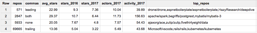 Let’s analyze 320 Gigabytes of open source SQL code to determine if we should use trailing or leading commas. Popularity is not enough — can we determine which style leads to success? Proposed SQL style guide: Prefer opening lines with a comma when needed. Don’t go and change all of the existing code just to comply with this rule. : Writing SQL code with leading commas is efficient — but enforcing standards just for the sake of it kill those efficiencies. Hypothesis Can I prove this? Background Many programming languages (C, Python, JavaScript, , …) will allow you to leave after the final element in a list. But others won’t, like SQL (or the JSON format). This has lead a vocal minority to advocate in favor of a dreadful practice: . Go a trailing comma Start new lines with a leading comma, in the name of efficient code writing and change management Would you prefer SQL code formatted like this: # trailing commas SELECT name, company, salary, state, city FROM `employees` WHERE state='CA' or like this: # leading commas SELECT name , company , salary , state , city FROM `employees` WHERE state='CA' Let’s bring the data Luckily we all have access to terabytes of . There is a huge table with all of the available extracted code — and your first step should be extracting only the code you are interested in, before performing further analysis. open source code ready to be analyzed in BigQuery To get all of the code inside “.sql” files out into a new table: #standardSQL SELECT a.id id, size, content, binary, copies, sample_repo_name, sample_path FROM ( SELECT id , ANY_VALUE(path) sample_path , ANY_VALUE(repo_name) sample_repo_name FROM `bigquery-public-data.github_repos.files` a WHERE PATH LIKE '%.sql' GROUP BY 1 ) a JOIN `bigquery-public-data.github_repos.contents` b ON a.id=b.id This gives us a table representing a total of 2 million SQL files out of GitHub — more than 320 GB of code! I left an improved public —so you can skip this first step. copy of this table in BigQuery First approach: Count number of lines, files, repos My first approach using data backfires: Findings: There are 50 million SQL lines that end with a comma, while only 1.4 million begin with one. There are 329,308 unique SQL files with trailing commas, while only 18,312 have leading ones. There are at least 72,506 repositories with SQL files containing trailing commas, while only 3,360 repositories with leading ones. There are way less projects and files using them. Summary: . Leading commas lose the popularity race Side note: There are also 5,647 SQL lines in 1,029 files that have commas at the beginning and the end. At least 360 repositories allow these monstrosities. Second approach: Incorporate success metrics Losing the popularity race is not the end of the road. We need to ask ourselves: “ ” Which projects are more successful ? How do we define success in GitHub? Number of stars? Number of stars last year? Number of stars this year? Number of active users? General activity levels? How about all of that! The rules: Each repository gets one vote, regardless of number of lines or files. Files present in many repositories get assigned to the one with most stars. Repositories will get assigned to one of four groups: Only leading or trailing commas, no commas at the start of end of a line, or a mix of both styles. These are my results: What we see here: . Most projects (at least 69,665 repos) show only trailing commas at the end of SQL lines. 571 repos show only leading commas, and 2,847 use a mix of both styles. Only a small percentage of projects enforce leading commas, many more allow a mix of styles, and the majority only trailing commas In average mixed style projects got 29.37 stars, 11.73 people involved, and >150 events during this year. In comparison SQL comma trailing only projects have 13.06 stars, 5.49 people involved, and less than 50 events this year (so far). Projects that allow a mix of styles show the most success. as the mixed ones, but still seem to do better than the only trailing ones. Projects that enforce leading commas don’t show as much success — comparing the total number of stars, the stars during 2016, and the stars, people, and activity during this ongoing 2017. The trend is stable throughout the years Query #standardSQL WITH comma_lines_per_files AS ( SELECT sample_repo_name, sample_stars_2016, sample_stars , REGEXP_CONTAINS(line, r',\s*$') has_trailing , REGEXP_CONTAINS(line, r'^\s*,') has_leading , line FROM `fh-bigquery.github_extracts.contents_sql` , UNNEST(SPLIT(content, '\n')) line WHERE line LIKE '%,%' AND LENGTH(line)>5 ), stats_per_repo AS ( SELECT sample_repo_name , MAX(has_leading) has_leading , MAX(has_trailing) has_trailing , ANY_VALUE(line) sample_line , ANY_VALUE(sample_stars) stars , ANY_VALUE(sample_stars_2016) stars_2016 , (SELECT COUNT(DISTINCT actor.id) FROM `githubarchive.month.2017*` WHERE sample_repo_name = repo.name AND type='WatchEvent') stars_2017 , (SELECT COUNT(DISTINCT actor.id) FROM `githubarchive.month.2017*` WHERE sample_repo_name = repo.name) actors_2017 , (SELECT COUNT(*) FROM `githubarchive.month.2017*` WHERE sample_repo_name = repo.name) activity_2017 FROM comma_lines_per_files GROUP BY sample_repo_name ) SELECT COUNT(DISTINCT sample_repo_name) repos , IF(has_trailing, IF(has_leading, 'both', 'trailing'), IF(has_leading, 'leading', 'none')) commas , ROUND(AVG(stars), 2) avg_stars , ROUND(AVG(stars_2016), 2) stars_2016 , ROUND(AVG(stars_2017), 2) stars_2017 , ROUND(AVG(actors_2017), 2) actors_2017 , ROUND(AVG(activity_2017), 2) activity_2017 , STRING_AGG(sample_repo_name ORDER BY stars DESC LIMIT 3) top_repos FROM stats_per_repo GROUP BY commas ORDER BY repos repos commas stars stars17 actors17 activity17 top_repos 571 leading 22.99 7.36 10.04 39.89 drone/drone,aspnetboilerplate/aspnetboilerplate,HazyResearch/deepdiv2847 both true 29.37 6.44 11.73 156.63 apache/spark,begriffs/postgrest,mybatis/mybatis-3 5933 none false 20.05 4.8 7.
